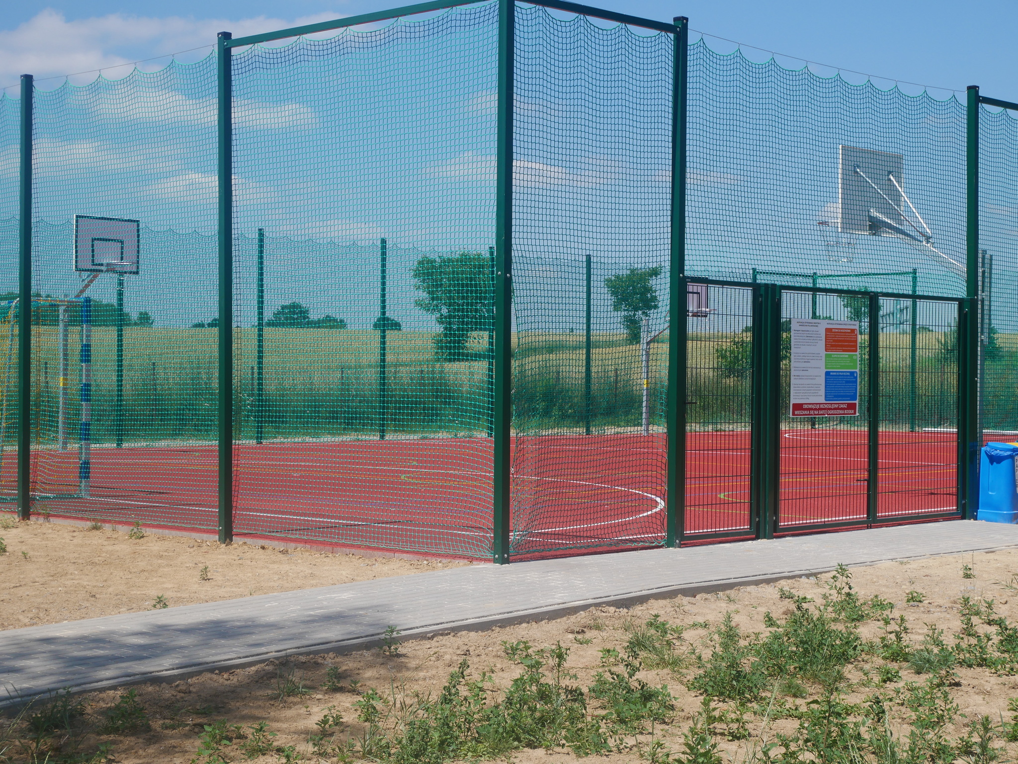 Zakres prac do wykonania: wykonanie robót ziemnych, montaż obrzeży betonowych, wykonanie podbudowy z kruszyw, wykonanie nawierzchni poliuretanowej z malowaniem linii wyznaczających pola gry, dostawa i montaż wyposażenia boisk, wykonanie ogrodzenia boiska stanowiącego jednocześnie piłkochwyty wraz z furtką i bramą wjazdową, wykonanie utwardzenia z kostki betonowej w celu ułatwienia dostępności dla osób niepełnosprawnych, dostawa pojemników do segregacji odpadów.