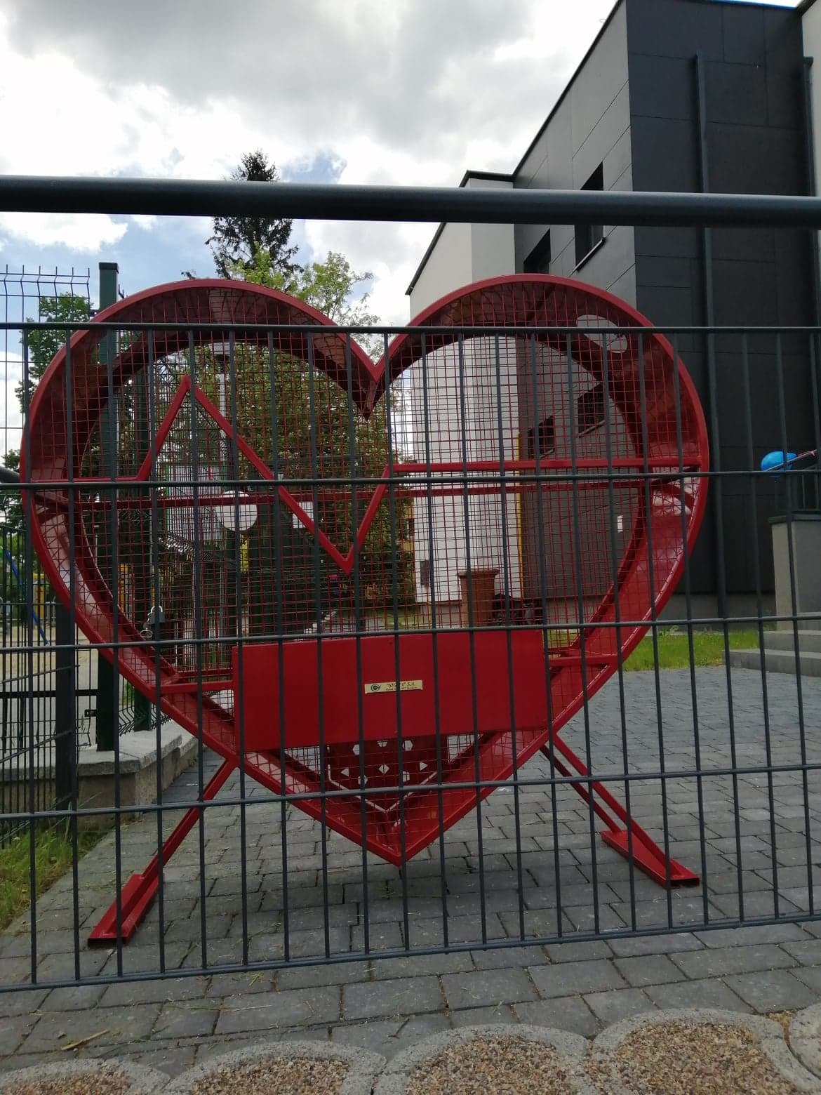 1 CZERWCA PRZY BUDYNKU GMINNEJ BIBLIOTEKI PUBLICZNEJ W JASTKOWIE STANĘŁO CZERWONE, METALOWE SERCE SŁUŻĄCE ZBIÓRCE PLASTIKOWYCH ZAKRĘTEK.