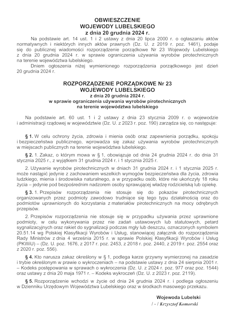 OBWIESZCZENIE WOJEWODY LUBELSKIEGO Z DNIA 20 GRUDNIA 2024R.