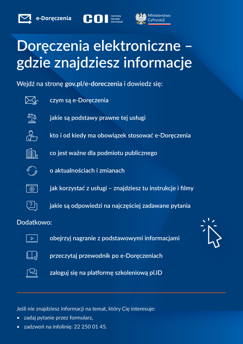 Od 1 stycznia 2025r podmioty publiczne są zobowiązane do prowadzenia korespondencji z wykorzystaniem skrzynki do doręczeń elektronicznych. Aby ułatwić tym podmiotom realizacje tego obowiązku, na stronie e-Doręczeń https://www.gov.pl/web/e-doreczenia utworzona została zakładkę z materiałami informacjami.