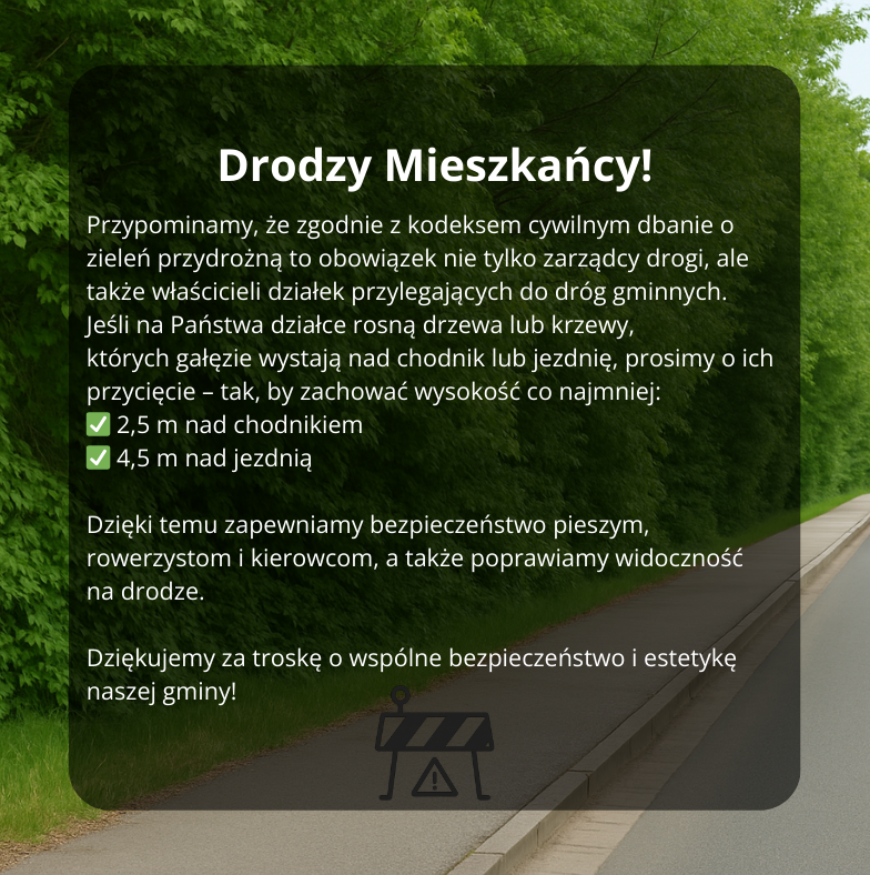 Przypominamy, że zgodnie z kodeksem cywilnym dbanie o zieleń przydrożną to obowiązek nie tylko zarządcy drogi, ale także właścicieli działek przylegających do dróg gminnych.