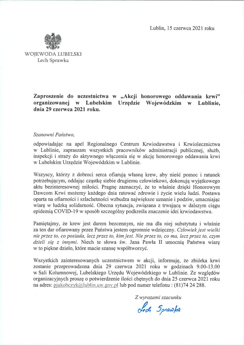 AKCJA HONOROWEGO ODDAWANIA KRWI W LUBELSKIM URZĘDZIE WOJEWÓDZKIM W LUBLINIE