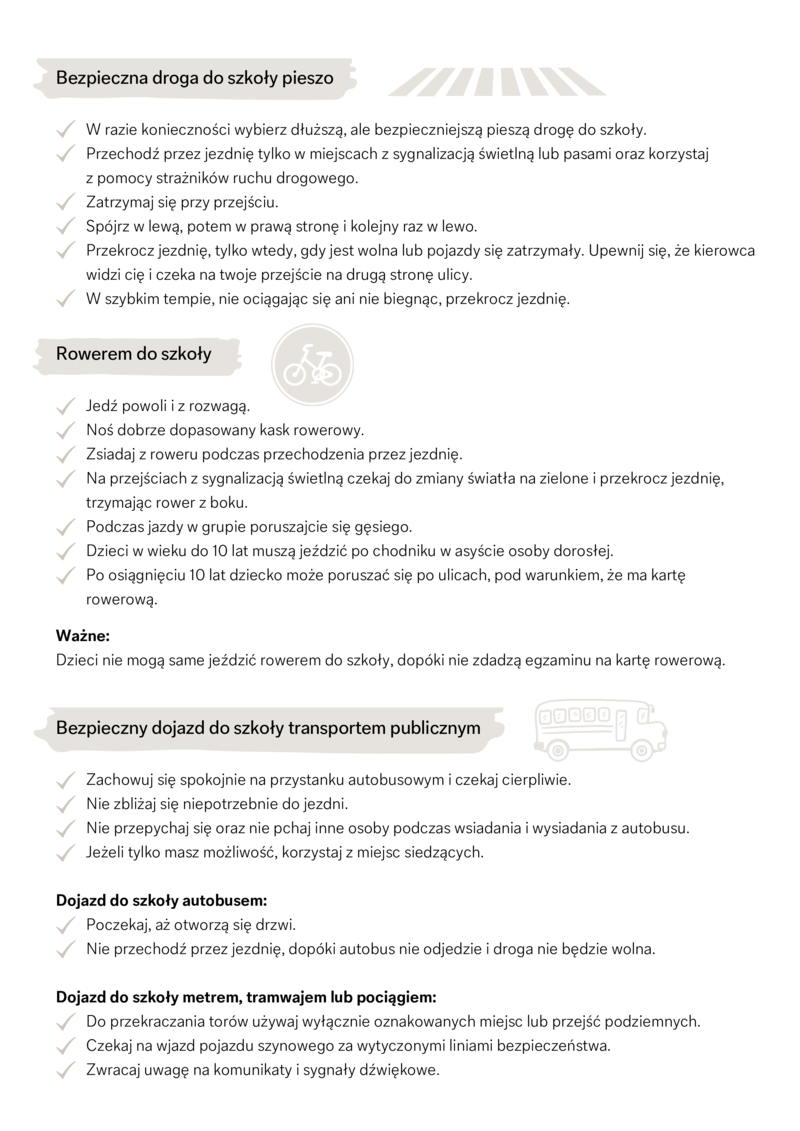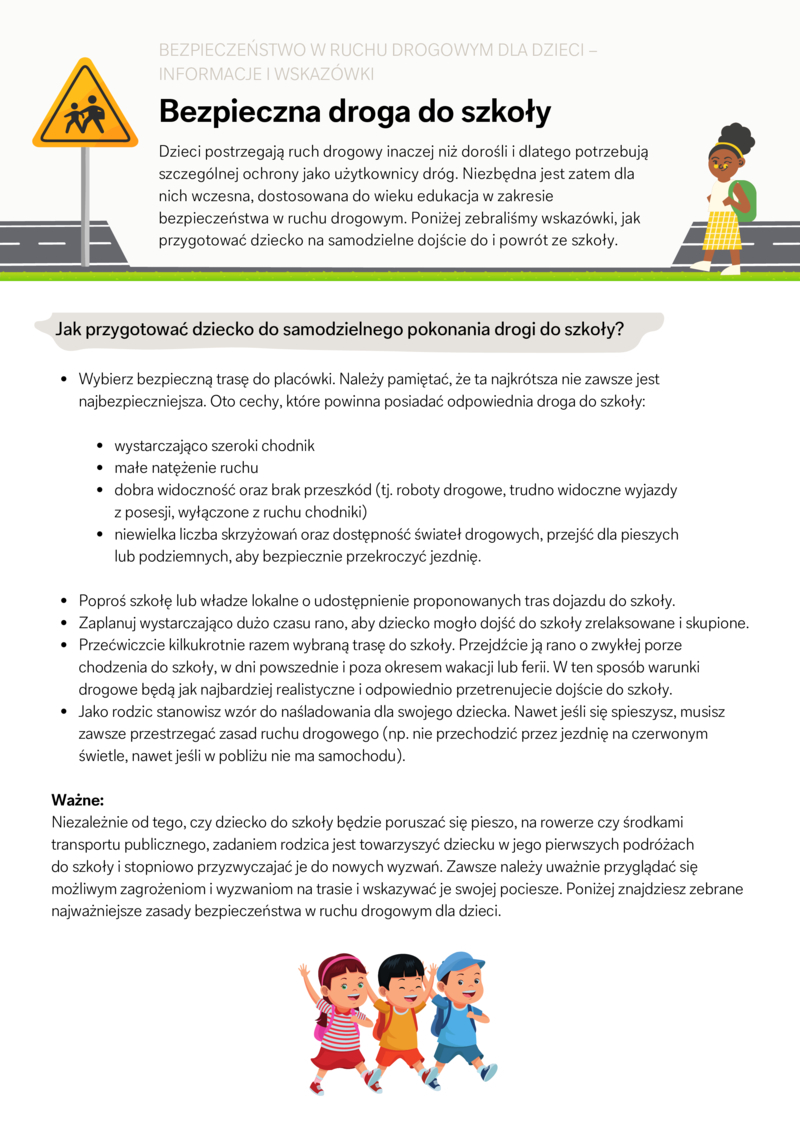 Pierwsze dni września to znakomita okazja, aby przypomnieć młodszym, ale i też starszym szkolniakom, jak bezpiecznie dojść lub dojechać do szkoły oraz z niej wrócić. Aby przygotować do tego uczniów, ale również rodziców i opiekunów. Specjalne poradniki na temat bezpieczeństwa dzieci w ruchu drogowym: