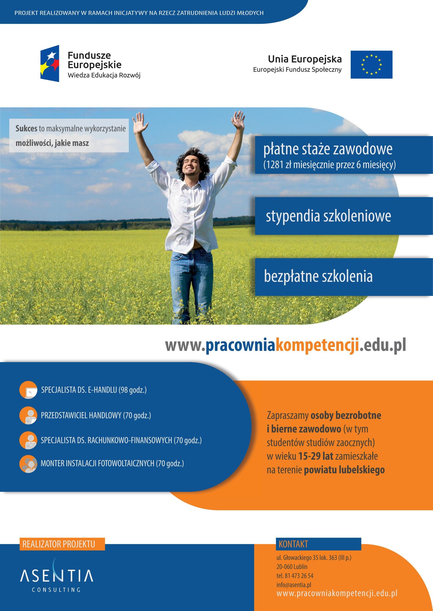 Asentia Consulting zaprasza osoby pozostające bez pracy do bezpłatnego udziału w projekcie Pracownia kompetencji 2 realizowanego w ramach Programu Operacyjnego Wiedza Edukacja Rozwój 2014-2020, Działanie 1.2 Wsparcie osób młodych pozostających bez pracy na regionalnym rynku pracy, Poddziałanie 1.2.2 Wsparcie udzielane z Inicjatywy na rzecz zatrudnienia ludzi młodych.