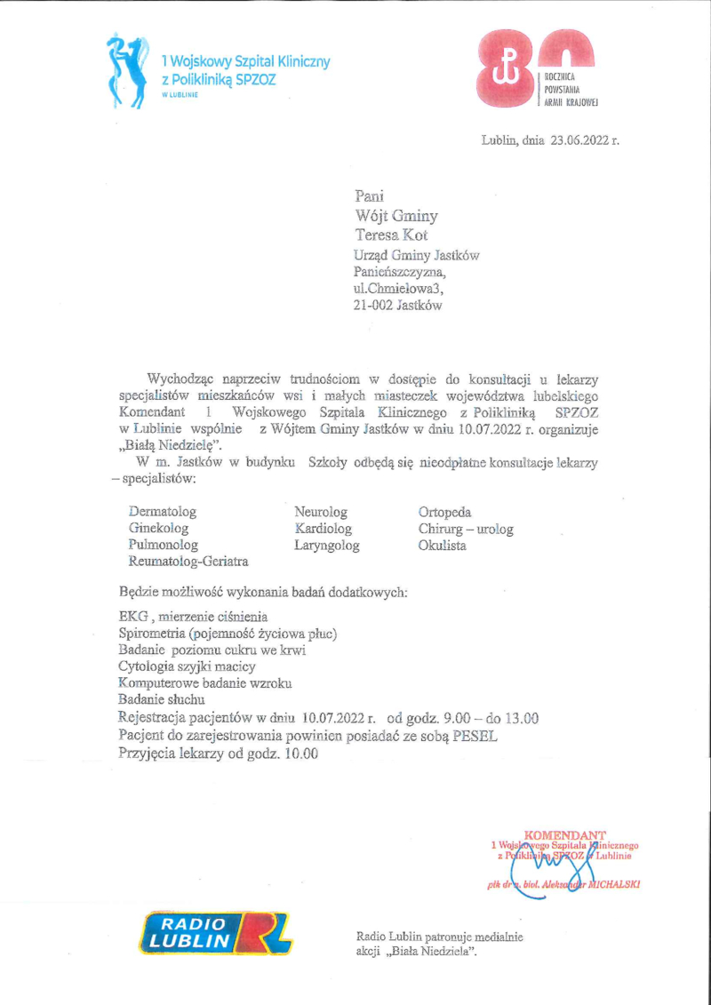 Komendant 1 Wojskowego Szpitala Klinicznego z Polikliniką SPZOZ w Lublinie wraz z Wójtem Gminy Jastków zaprasza do udziału w nieodpłatnych konsultacjach lekarzy - specjalistów w ramach "Białej Niedzieli", która odbędzie się w dniu 10.07.2022r. w Szkole Podstawowej w Jastkowie.