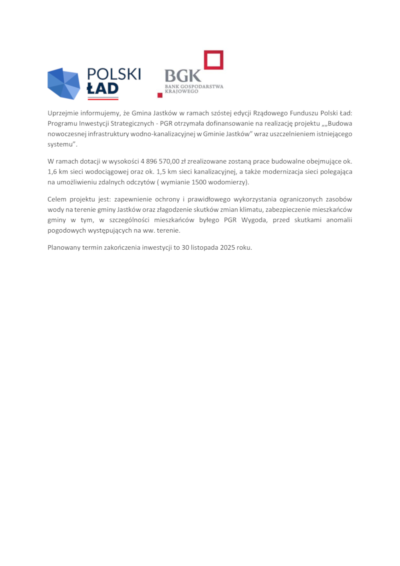 "BUDOWA NOWOCZESNEJ INFRASTRUKTURY WODNO-KANALIZACYJNEJ W GMINIE JASTKÓW” WRAZ USZCZELNIENIEM ISTNIEJĄCEGO SYSTEMU”.