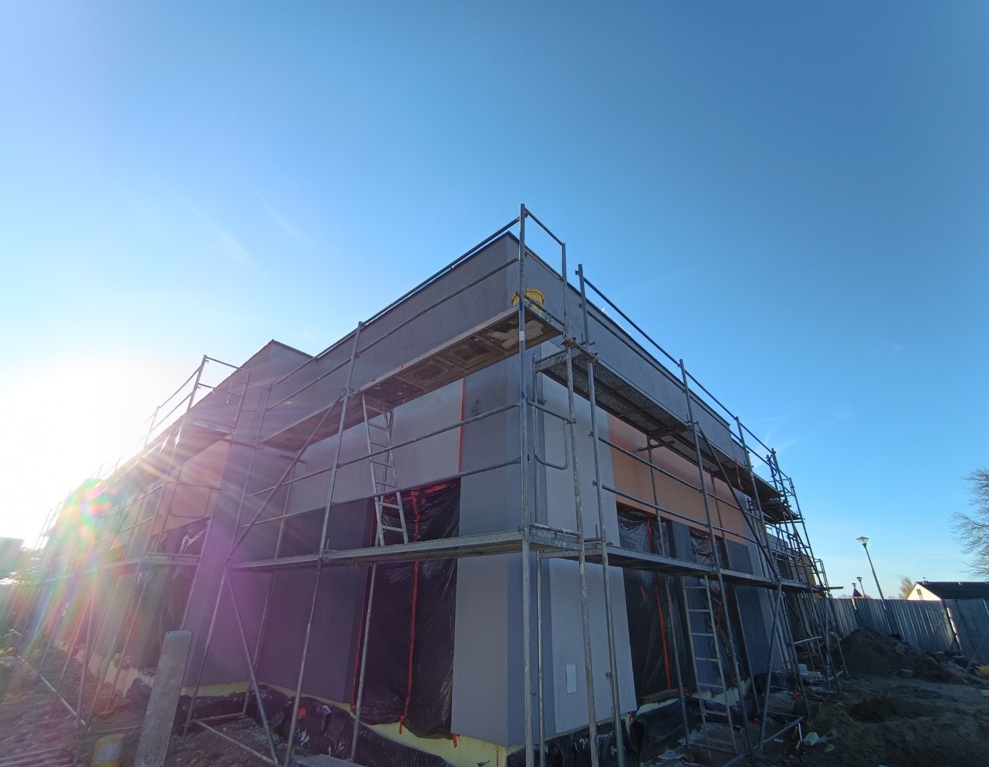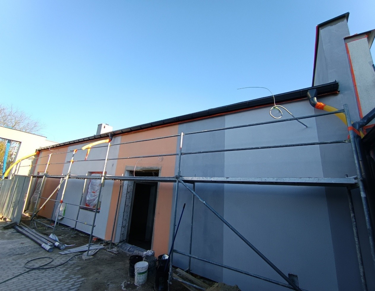 Na zewnątrz także sporo się dzieje – cały budynek został ocieplony styropianem i wełną mineralną, wykonano warstwę zbrojącą z siatki, całość zagruntowano, a teraz trwa nakładanie tynku elewacyjnego. Budynek zaczyna nabierać swojego ostatecznego wyglądu!