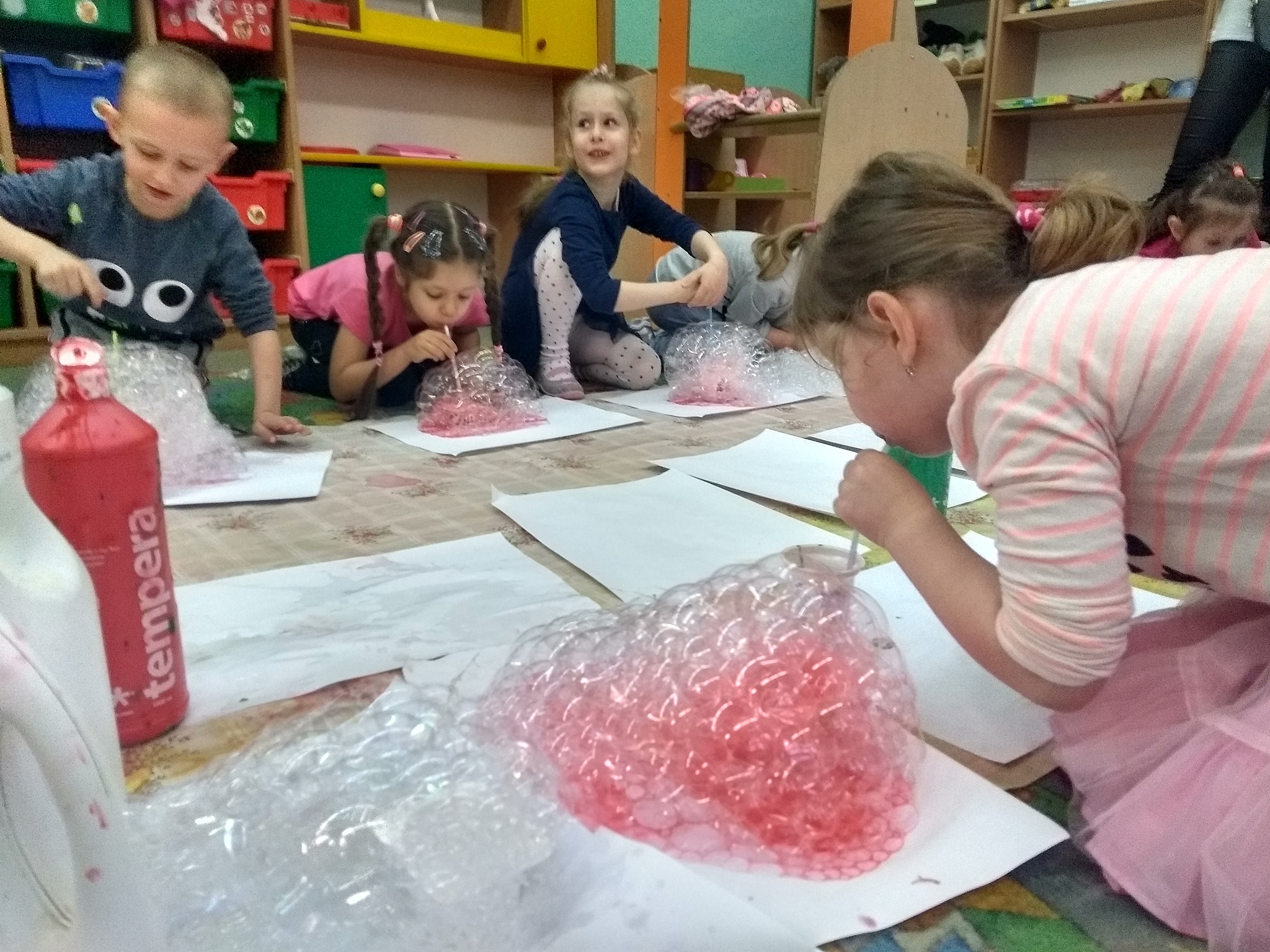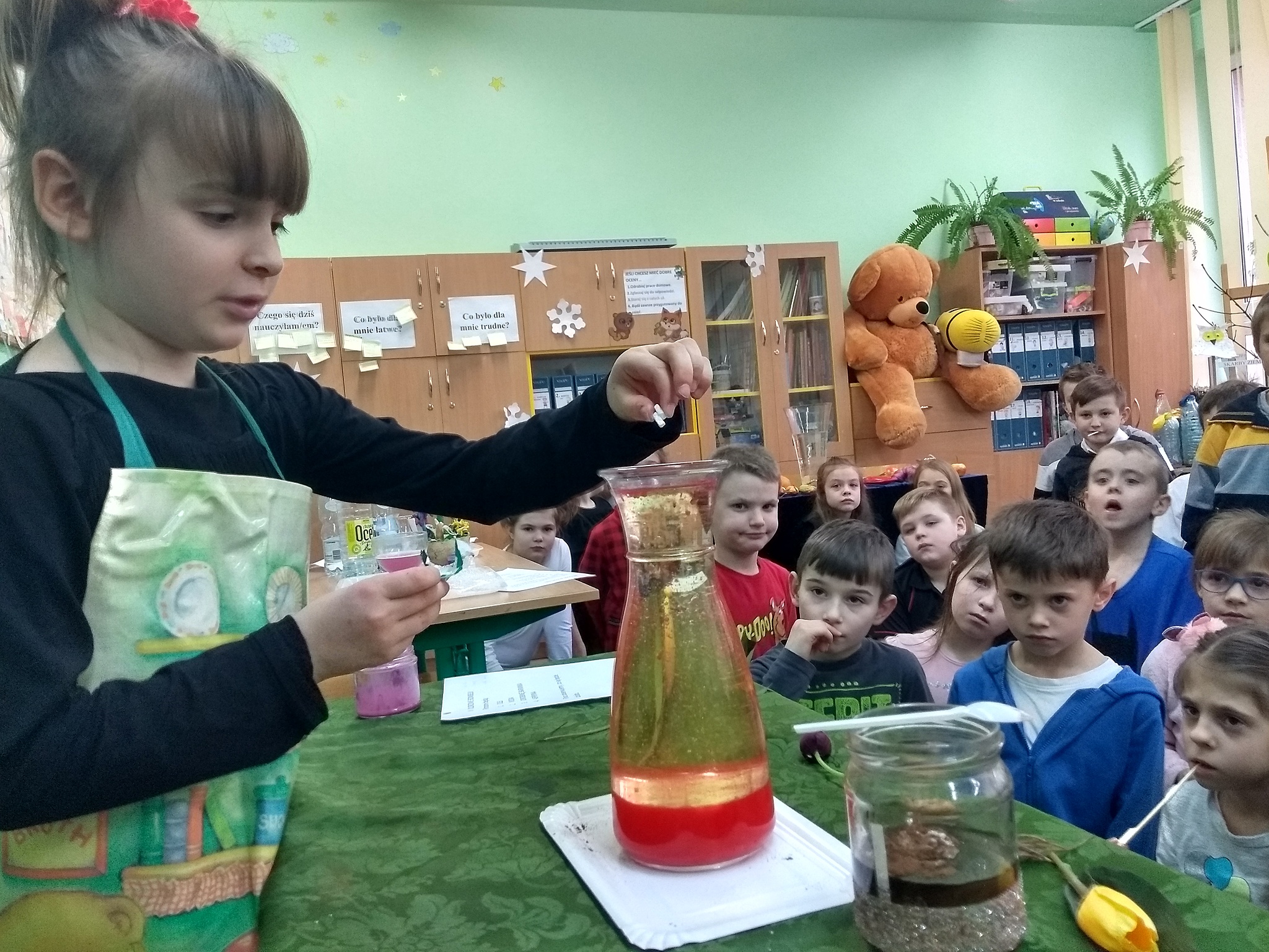 Następnie, pod opieką starszych koleżanek i kolegów, którzy w tym dniu pełnili rolę przewodników po szkole, dzieci ruszyły na zajęcia przygotowane w salach. Wszyscy zainteresowani przekonali się, jak szkoła wygląda od wewnątrz, co w niej jest ciekawego i w jaki sposób można spędzić tu czas. Przygotowano wiele interesujących zajęć warsztatowych: „Mydełko”, „Owocowe szaszłyki”, „Bańki mydlane”, „Biżuteria Królowej Śniegu”, „Łamigłówki mądrej główki”, a w „Sali doświadczeń” każdy został odkrywcą tajemnicy wulkanów Bombolandii.