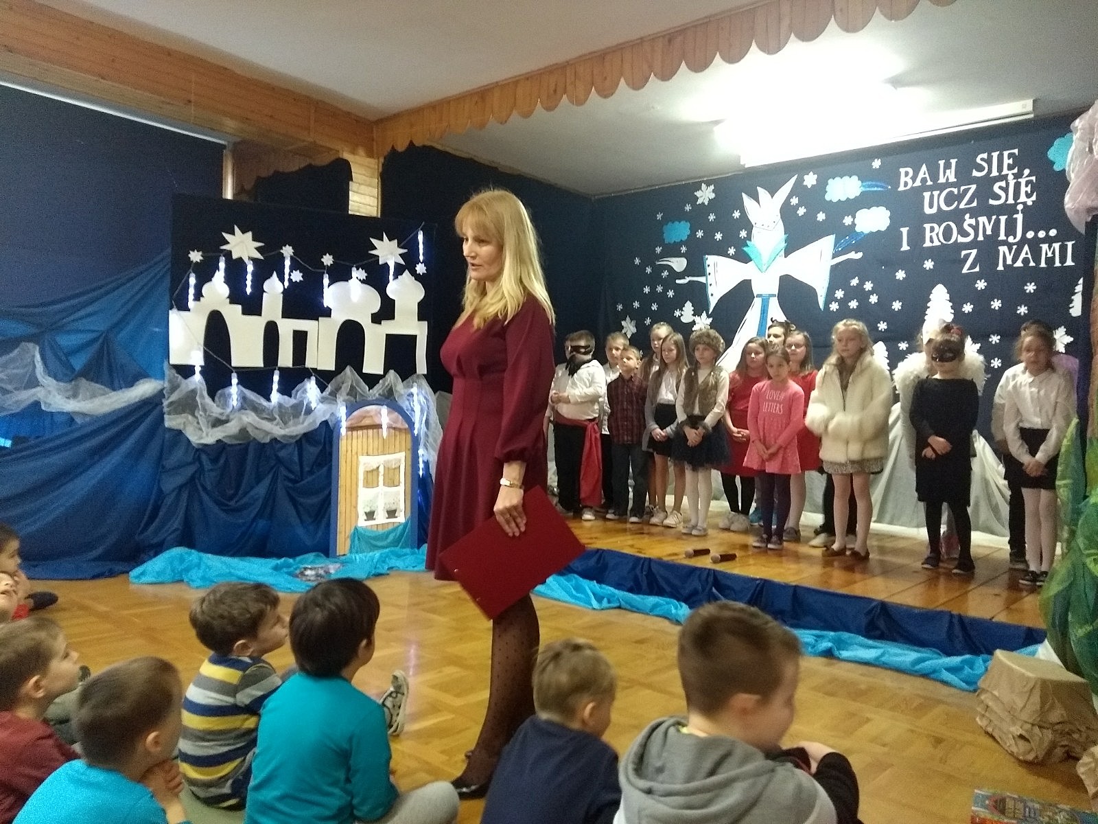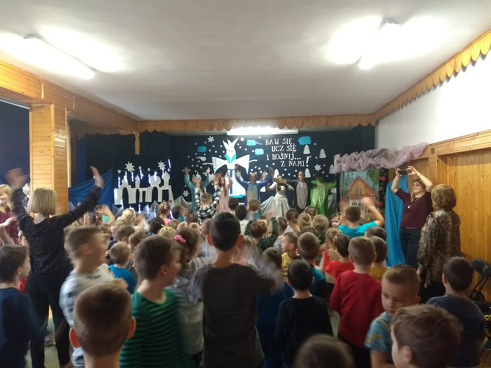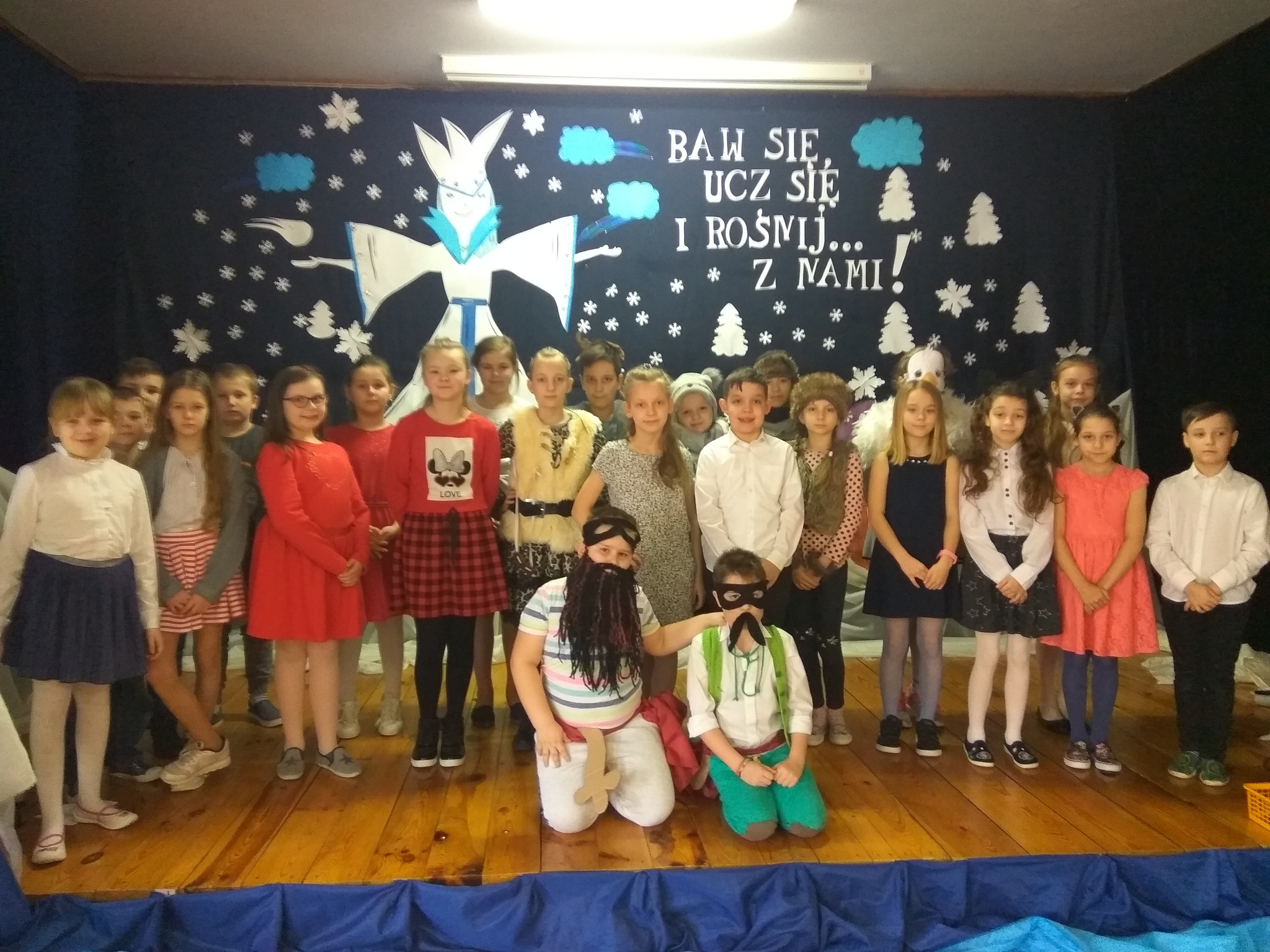 Na początek Goście obejrzeli przedstawienie pt. „Królowa Śniegu”. Inscenizację przygotowali uczniowie klas trzecich, wykazując się doskonałą grą aktorską i znajomością pięknie zaśpiewanych piosenek. Bogata scenografia i stroje dzieci nadały niezapomniany koloryt barwnemu widowisku, które zyskało aplauz widzów.