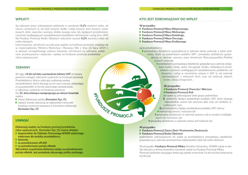 Krajowy Ośrodek Wsparcia Rolnictwa Oddział Terenowy w Lublinie informuje, że zgodnie z ustawą z dnia 22 maja 2009 r. o funduszach promocji produktów rolno- spożywczych (Dz.U. z 2021 r. poz. 1496, z późn. zm.), do naliczania, pobierania i przekazywania wpłat na fundusze promocji oraz do składania kwartalnych deklaracji zobowiązani są: