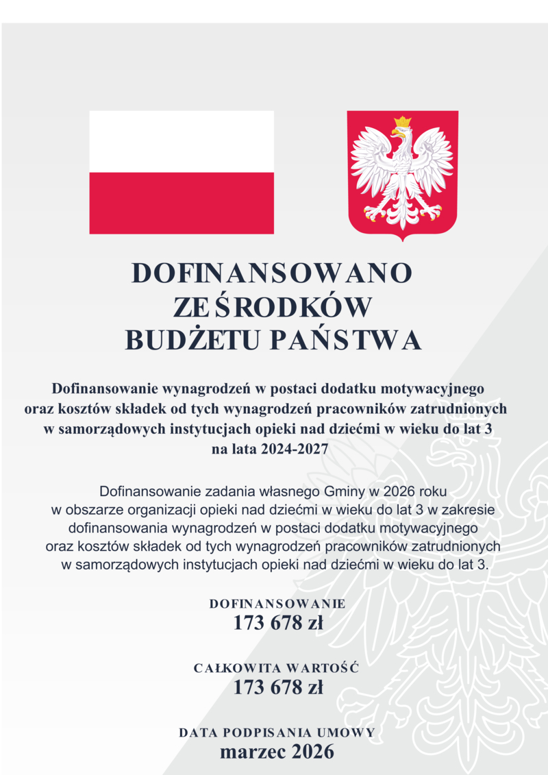 W dniu 27 marca 2026 r. została podpisana umowa w sprawie dofinansowania ze środków budżetu państwa zadania własnego Gminy realizowanego w 2026 roku w obszarze organizacji opieki nad dziećmi w wieku do lat 3 w zakresie dofinansowania wynagrodzeń w postaci dodatku motywacyjnego oraz kosztów składek od tych wynagrodzeń pracowników zatrudnionych w samorządowych instytucjach opieki nad dziećmi w wieku do lat 3.