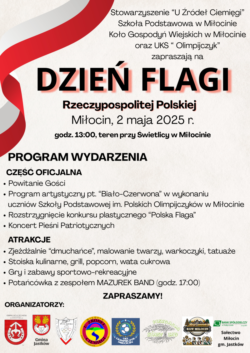 Serdecznie zapraszamy na obchody Dnia Flagi Rzeczypospolitej Polskiej, które odbędą się 2 maja 2025 r. o godz. 13:00 na terenie przy świetlicy w Miłocinie.