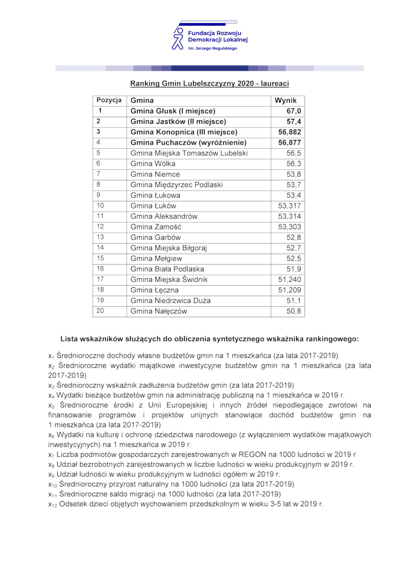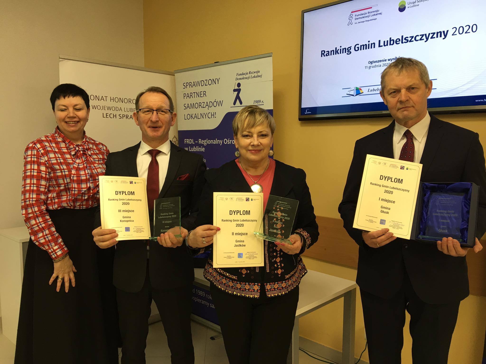 W dniu dzisiejszym - 11 grudnia 2020 r na uroczystej gali, zorganizowanej przez Fundację Rozwoju Demokracji Lokalnej Regionalny Ośrodek w Lublinie we współpracy z Urzędem Statystycznym, nastąpiło wręczenie wyróżnień dla 20 najlepszych gmin według Rankingu Gmin Lubelszczyzny. Pani Wójt Teresa Kot odebrała zaszczytne wyróżnienie dla Gminy Jastków, która uplasowała się w 2020 roku na 2 pozycji. W roku 2019 nasza gmina zajęła w tym samym rankingu miejsce 3, w 2018  miejsce 7 a w 2017 miejsce 10.Ocenie poddawane są wszystkie gminy województwa lubelskiego z wyłączeniem miast na prawach powiatu.