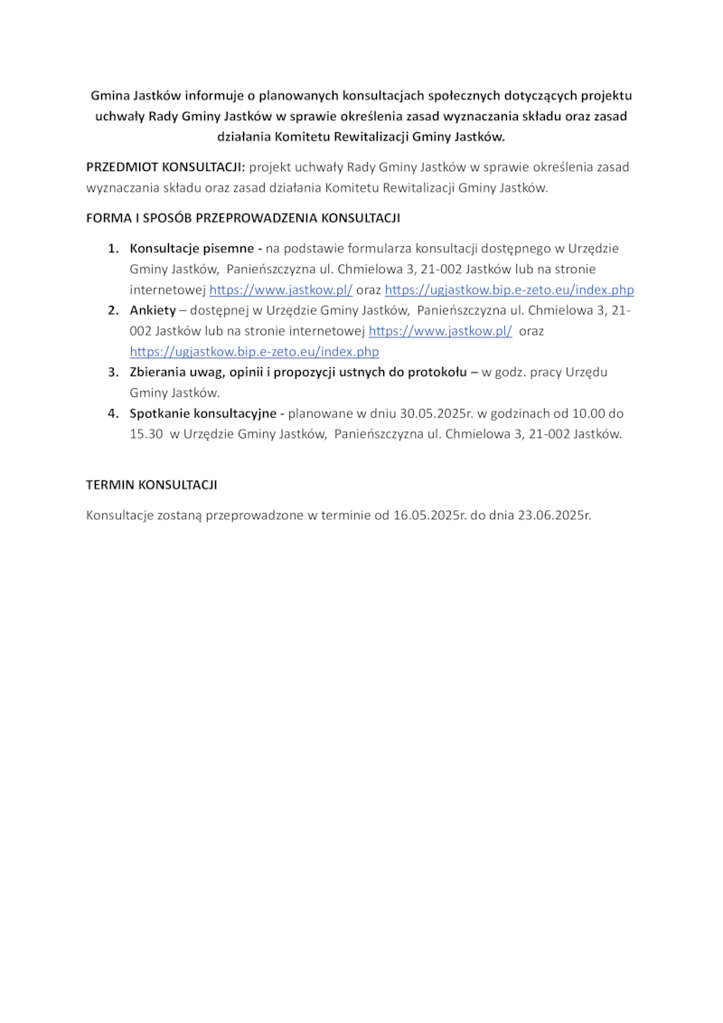 GMINA JASTKÓW INFORMUJE O PLANOWANYCH KONSULTACJACH SPOŁECZNYCH DOTYCZĄCYCH PROJEKTU UCHWAŁY RADY GMINY JASTKÓW W SPRAWIE OKREŚLENIA ZASAD WYZNACZANIA SKŁADU ORAZ ZASAD DZIAŁANIA KOMITETU REWITALIZACJI GMINY JASTKÓW.