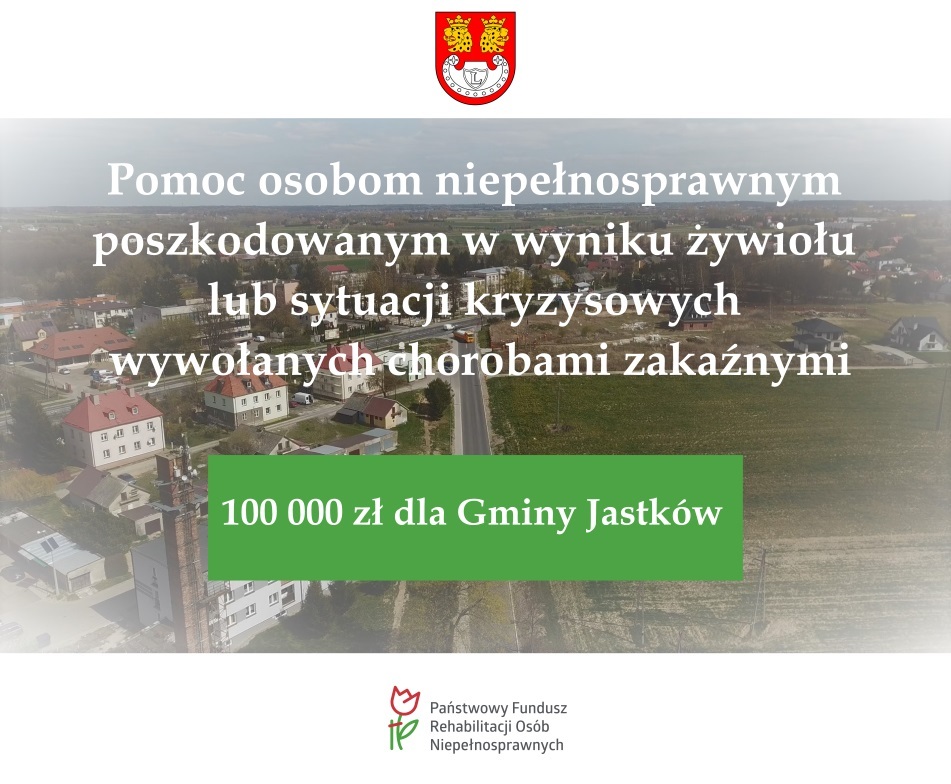 Gmina Jastków otrzymała z PFRON środki finansowe na realizację programu pn. „Pomoc osobom niepełnosprawnym poszkodowanym w wyniku żywiołu lub sytuacji kryzysowych wywołanych chorobami zakaźnymi”, Moduł IV w wysokości 100 000 zł.