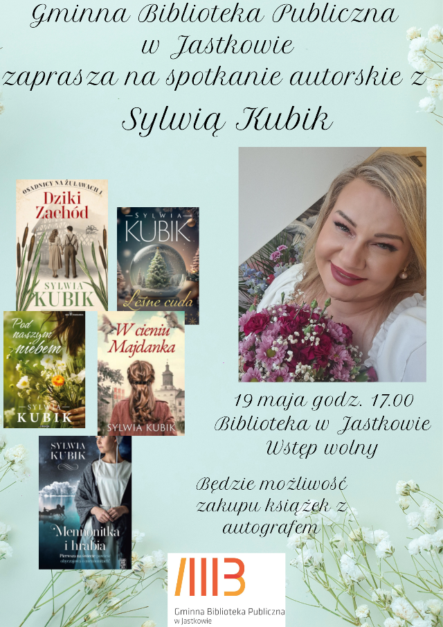 GMINNA BIBLIOTEKA PUBLICZNA W JASTKOWIE ZAPRASZA NA SPOTKANIE Z PISARKA SYLWIĄ KUBIK.