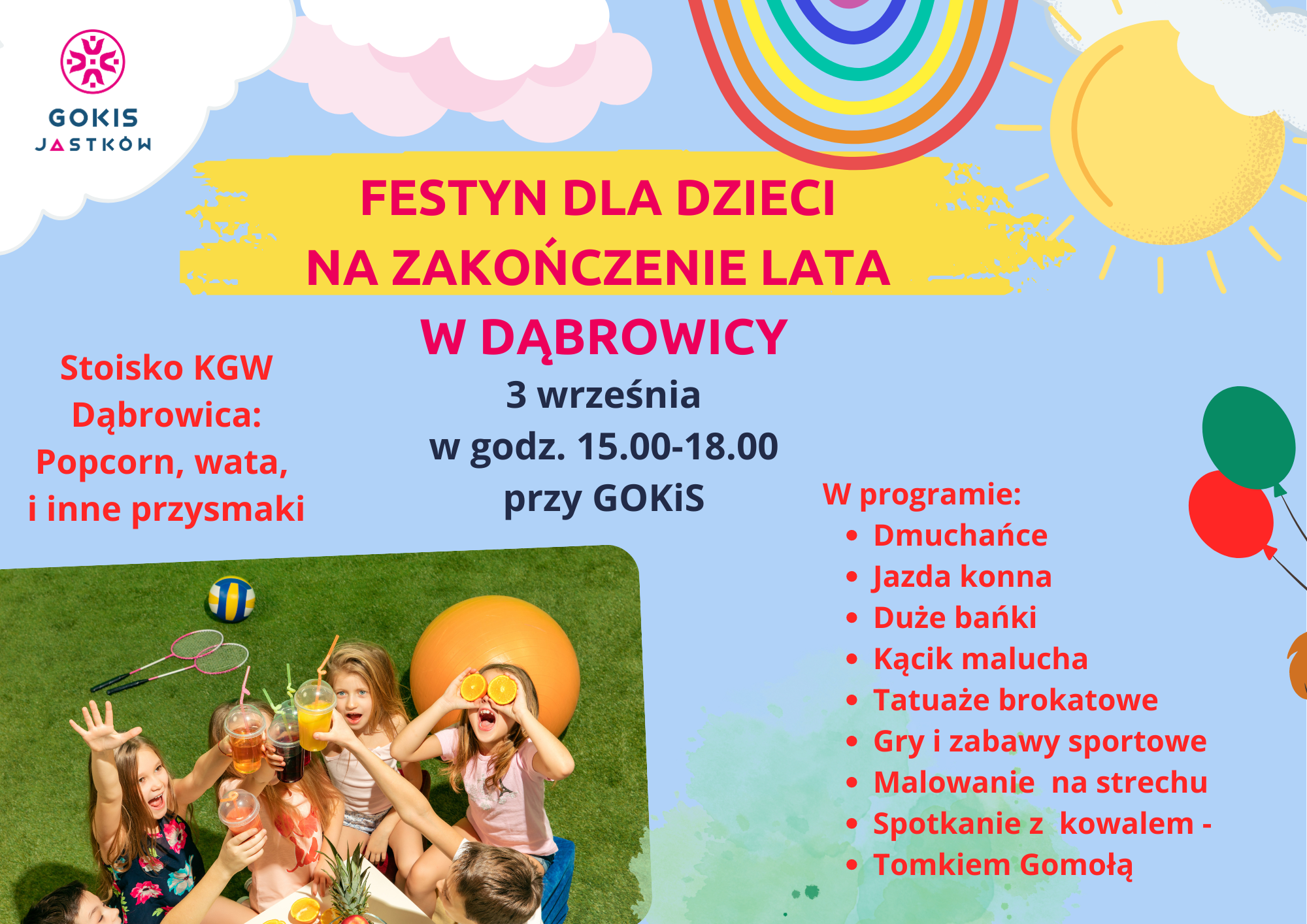 GMINNY OŚRODEK KULTURY I SPORTU ZAPRASZA DZIECI NA FESTYN Z OKAZJI ZAKOŃCZENIA LATA.