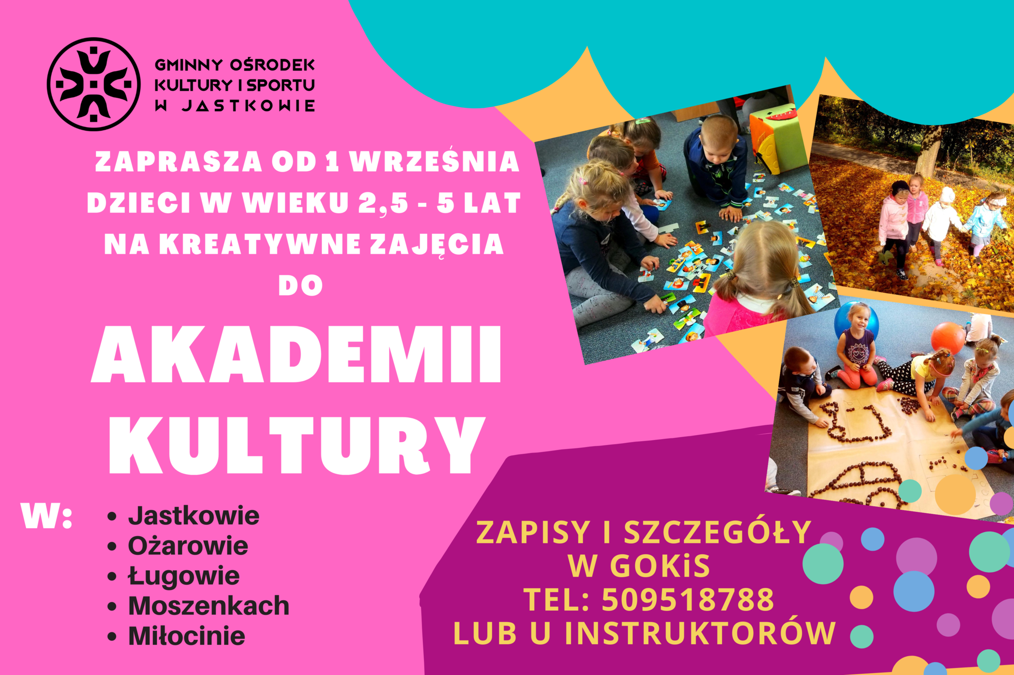 Gminny Ośrodek Kultury i Sportu zaprasza serdecznie dzieci w wieku 2-5 lat na zajęcia w Akademiach Kultury na terenie Gminy Jastków.