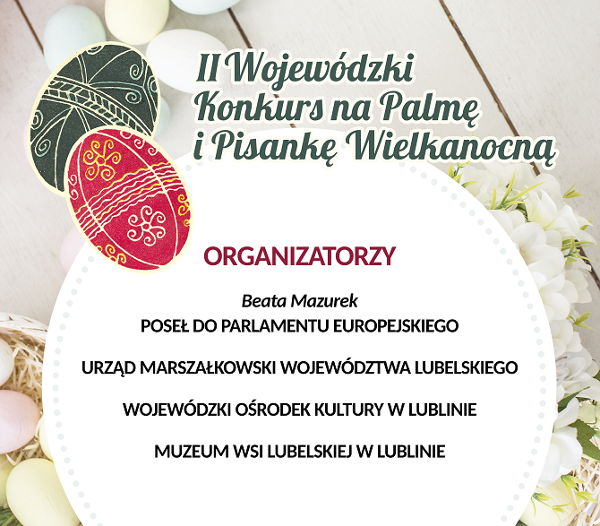 Następnie z naszej gminy zostaną wytypowane łącznie trzy pisanki wielkanocne (jedną wykonaną techniką tradycyjną, jedną wykonaną techniką współczesną i jedną pracę zbiorową) oraz trzy palmy wielkanocne (jedną wykonaną techniką tradycyjną, jedną wykonaną techniką współczesną i jedną pracę zbiorową), które przekażemy do Starostwa Powiatowego w Lublinie.