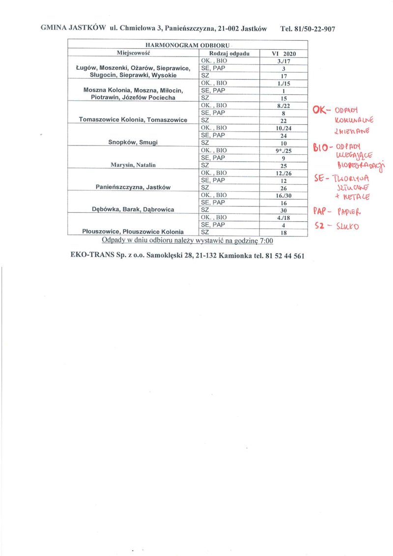 HARMONOGRAM ODBIORU ODPADÓW NA CZERWIEC