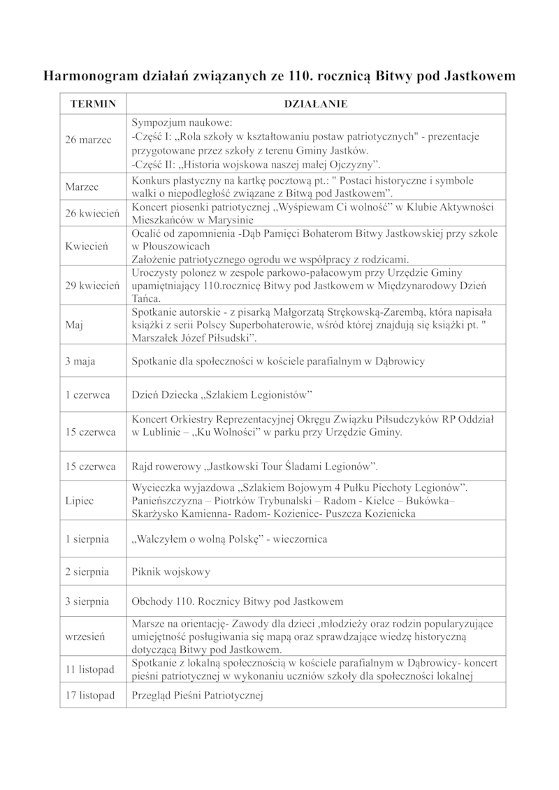 HARMONOGRAM UROCZYSTOŚCI I DZIAŁAŃ W RAMACH 110.ROCZNICY BITWY POD JASTKOWEM
