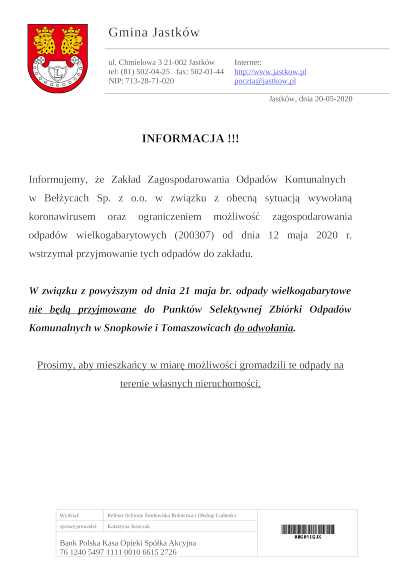 INFORMACJA!!! WSTRZYMANIE PRZYJMOWANIA ODPADÓW WIELKOGABARYTOWYCH.