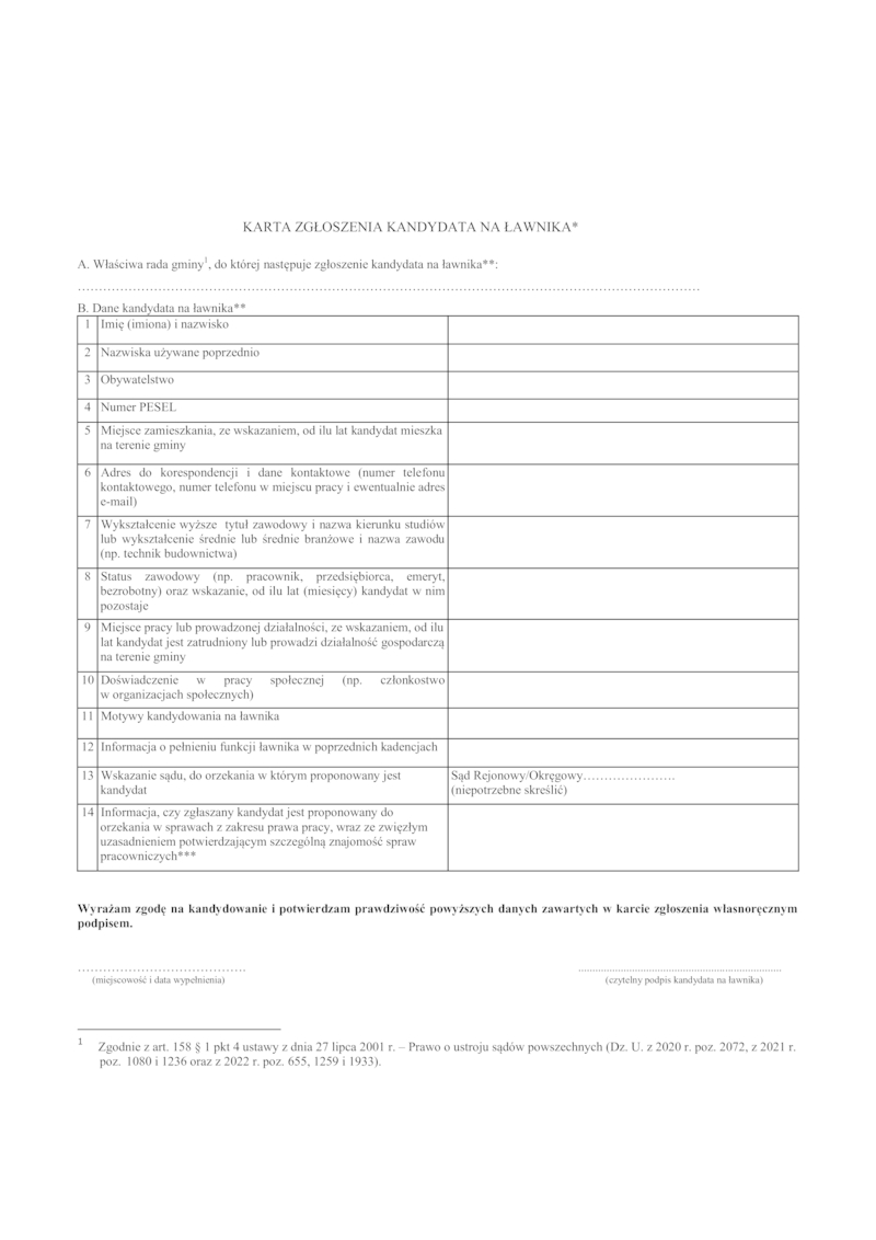 Zgłoszenia kandydatów na ławników dokonuje się na karcie zgłoszenia. Wzór karty zgłoszenia zawarty jest w Rozporządzeniu Ministra Sprawiedliwości z dnia 9 czerwca 2011 r. w sprawie sposobu postępowania z dokumentami złożonymi radom gmin przy zgłaszaniu kandydatów na ławników oraz wzoru karty zgłoszenia - Dz. U. z 2011 r., nr 121, poz. 693.