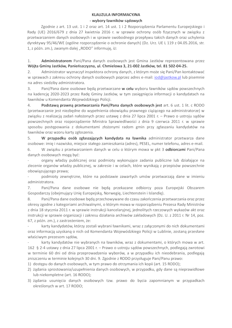 W związku z upływem w dniu 31 grudnia 2023 roku czteroletniej kadencji ławników działających przy sądach powszechnych, Prezes Sądu Okręgowego w Lublinie zwrócił się do Rady Gminy Jastków z wnioskiem o dokonanie wyboru 1 ławnika na kadencję 2024 – 2027 dla Sądu Okręgowego w Lublinie oraz 2 ławników na kadencję 2024-2027 dla Sądu Rejonowego Lublin-Zachód w Lublinie, w tym 1 do orzekania w sprawach z zakresu prawa pracy.
