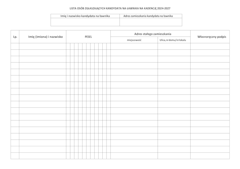 Do zgłoszenia kandydata na ławnika dokonanego na karcie zgłoszenia przez obywateli dołącza się również listę osób zawierającą imię (imiona), nazwisko, numer ewidencyjny PESEL, miejsce stałego zamieszkania i własnoręczny podpis każdej z pięćdziesięciu osób zgłaszających kandydata. Osobą uprawnioną do składania wyjaśnień w sprawie zgłoszenia kandydata na ławnika przez obywateli jest osoba, której nazwisko zostało umieszczone jako pierwsze na liście.
