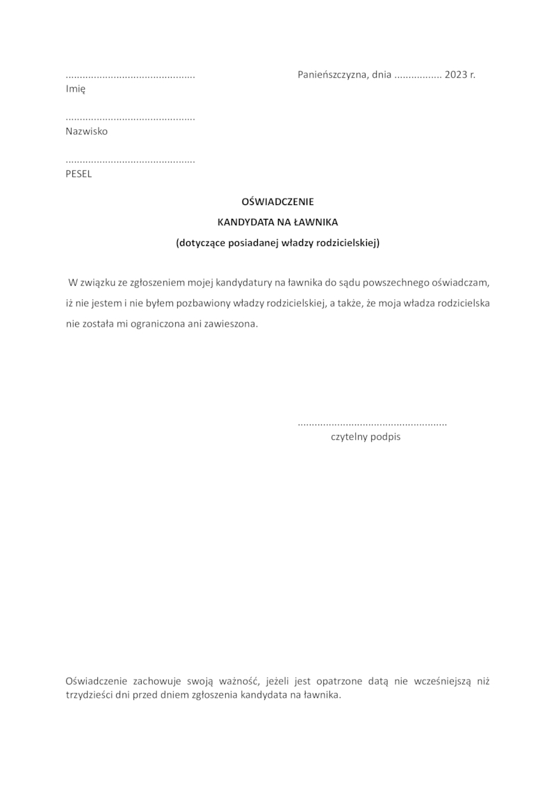 3) oświadczenie kandydata, że nie jest lub nie był pozbawiony władzy rodzicielskiej, a także, że władza rodzicielska nie została mu ograniczona ani zawieszona;