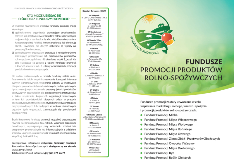 Krajowy Ośrodek Wsparcia Rolnictwa Oddział Terenowy w Lublinie informuje, że zgodnie z ustawą z dnia 22 maja 2009 r. o funduszach promocji produktów rolno–spożywczych (Dz.U. z 2025 r. poz. 683), od 1 kwietnia 2026 r. deklaracje wpłaty na fundusze promocji produktów rolno-spożywczych (formularz FPZ_f1), będą składane wyłącznie w formie dokumentu elektronicznego opatrzonego kwalifikowanym podpisem elektronicznym albo podpisem zaufanym, albo podpisem osobistym, za pomocą portalu eRolnik: https://erolnik.gov.pl/#/. Jednocześnie Oddział Terenowy przypomina, iż do naliczania, pobierania i przekazywania wpłat na fundusze promocji oraz do składania kwartalnych deklaracji zobowiązani są: przedsiębiorcy prowadzący działalność gospodarczą w zakresie uboju świń, bydła, koni, owiec, drobiu; przedsiębiorcy będący podatnikami podatku od towarów i usług w rozumieniu ustawy o VAT, którzy prowadzą działalność gospodarczą w zakresie wywozu poza terytorium Rzeczypospolitej Polskiej żywych świń, bydła, koni, owiec, drobiu; przedsiębiorcy prowadzący działalność gospodarczą w zakresie przetwórstwa zbóż; przedsiębiorcy będący podatnikami podatku od towarów i usług w rozumieniu ustawy o VAT, którzy:- skupują owoce lub warzywa od rolników ryczałtowych w celu ich przetworzenia lub odsprzedaży, - wytwarzają owoce i warzywa; przedsiębiorcy będący podatnikami podatku od towarów i usług w rozumieniu ustawy o VAT, którzy skupują ryby od rolników ryczałtowych, w celu ich przetworzenia lub odprzedaży, bądź prowadzący działalność w zakresie połowu ryb w wodach śródlądowych lub morskich, bądź prowadzący działalność w zakresie chowu lub hodowli ryb; podmioty skupujące rośliny oleiste od ich producenta (każdy podmiot, który nabywa towar od producenta, niezależnie od formy prawnej oraz rodzaju prowadzonej działalności) od dnia 01.04.2025r. Wpłaty w wysokości 0,1 % wartości netto nalicza się na: Fundusz Promocji Mięsa Wieprzowego, Fundusz Promocji Mięsa Wołowego, Fundusz Promocji Mięsa Końskiego, Fundusz 20-093 Lublin ul. Chodźki 10A, tel. 81/532 21 12, www.gov.pl/kowr Promocji Mięsa Owczego, Fundusz Promocji Ziarna Zbóż i Przetworów Zbożowych, Fundusz Promocji Owoców i Warzyw, Fundusz Promocji Mięsa Drobiowego, Fundusz Promocji Ryb, natomiast w wysokości 0,2% wartości netto nalicza się w przypadku Funduszu Promocji Roślin Oleistych. Naliczenie i pobranie powinno nastąpić nie później niż w terminie 14 dni od daty wystawienia faktury za ww. towary. Przedsiębiorcy zgodnie z ustawą o funduszach promocji produktów rolno-spożywczych składają deklarację do Dyrektora Generalnego KOWR za pośrednictwem Oddziału Terenowego KOWR właściwego terytorialnie dla siedziby przedsiębiorcy po zakończeniu kwartału, którego dotyczy, lecz nie później niż do 25 dnia miesiąca następującego po każdym kolejnym kwartale. Wraz ze złożeniem deklaracji przedsiębiorca powinien dokonać wpłaty kwoty naliczonej na rachunek bankowy danego funduszu wskazanego w deklaracji. Dyrektorowi Generalnemu KOWR przysługują uprawnienia kontrolne podmiotów w zakresie poprawności wywiązywania się z ustawowych obowiązków wpłat na fundusze promocji. Wszystkie informacje dotyczące funduszy promocji, dostępne są również na stronie https://www.gov.pl/web/kowr zakładka FUNDUSZE PROMOCJI lub dzwoniąc pod nr tel. 81 307 97 54, 81 536 37 15.