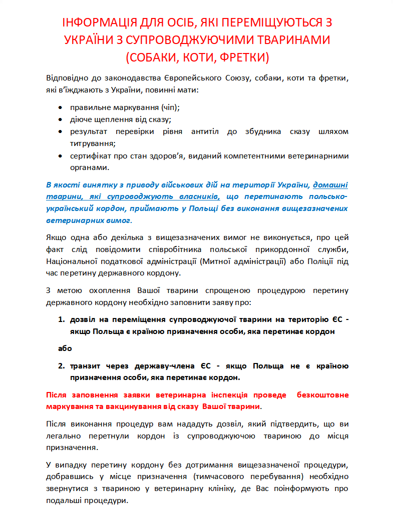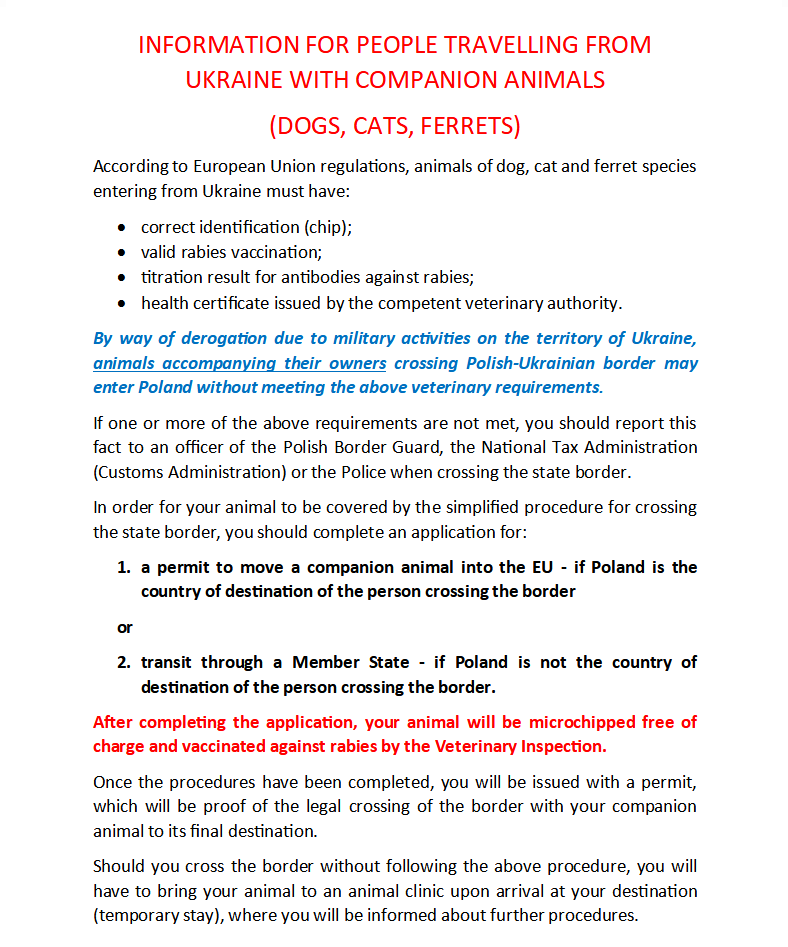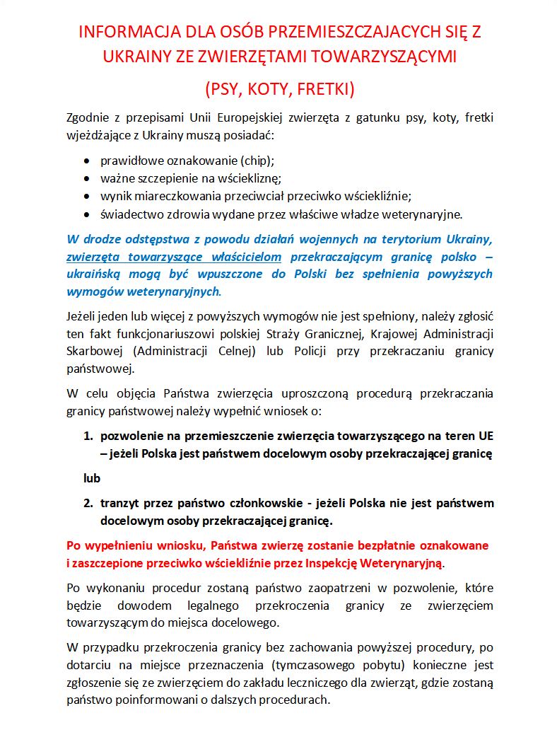 INFORMUJEMY, ZE W ZWIĄZKU Z DUŻA ILOŚCIĄ ZWIERZĄT PRZEBYWAJĄCYCH NA TERENIE RZECZPOSPOLITEJ POLSKIEJ WRAZ Z UCHODŹCAMI Z UKRAINY PLW W LUBLINIE NA TERENIE LUBLINA WYZNACZYŁ ZAKŁADY LECZNICZE DLA ZWIERZĄT, W KTÓRYCH UCHODŹCY BEZPŁATNIE MOGĄ OZNAKOWAĆ ORAZ ZASZCZEPIĆ PRZECIWKO WŚCIEKLIŹNIE SWOJE ZWIERZĘTA