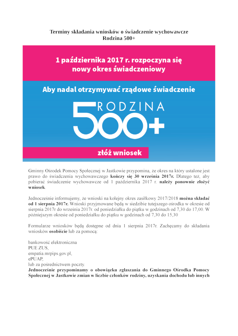 Gminny Ośrodek Pomocy Społecznej w Jastkowie przypomina, że okres na który ustalone jest prawo do świadczenia wychowawczego kończy się 30 września 2017r. Dlatego też, aby pobierać świadczenie wychowawcze od 1 października 2017 r. należy ponownie złożyć wniosek.