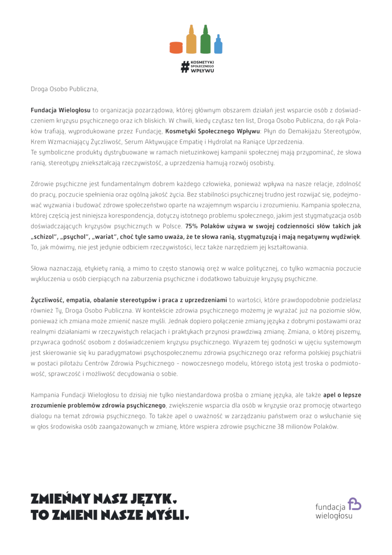 zapraszamy do wsparcia ogólnopolskiej kampanii społecznej „Kosmetyki Społecznego Wpływu”, prowadzonej przez Fundację Wielogłosu. Celem projektu jest przeciwdziałanie stygmatyzacji osób z doświadczeniem kryzysu psychicznego oraz promocja języka i postaw, które sprzyjają empatii, życzliwości i otwartości.