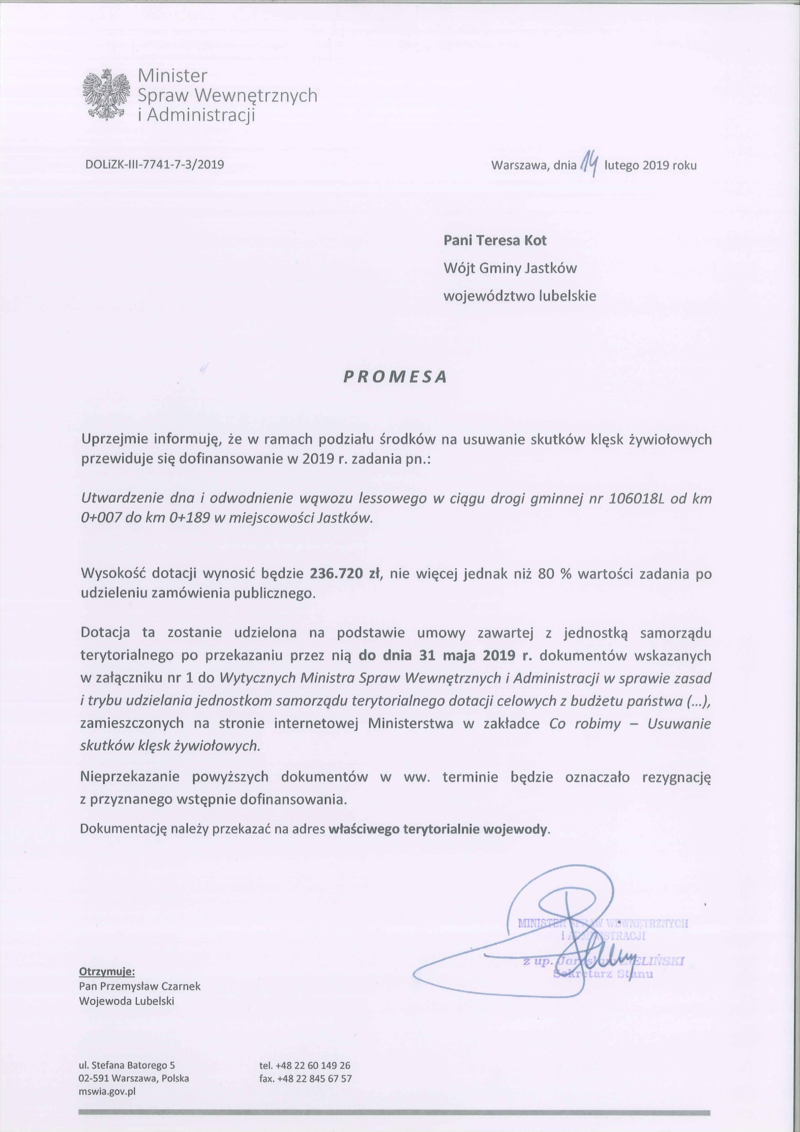 11 marca Wójt Gminy Jastków Teresa Kot odebrała w Urzędzie Wojewódzkim w Lublinie z rąk Wicemarszałka Sejmu RP Beaty Mazurek promesę Ministra Spraw Wewnętrznych i Administracji na dofinansowanie w 2019 roku zadań dotyczących zabezpieczenia wąwozów lessowych przed erozją, likwidacji osuwisk oraz usuwania skutków klęsk żywiołowych.