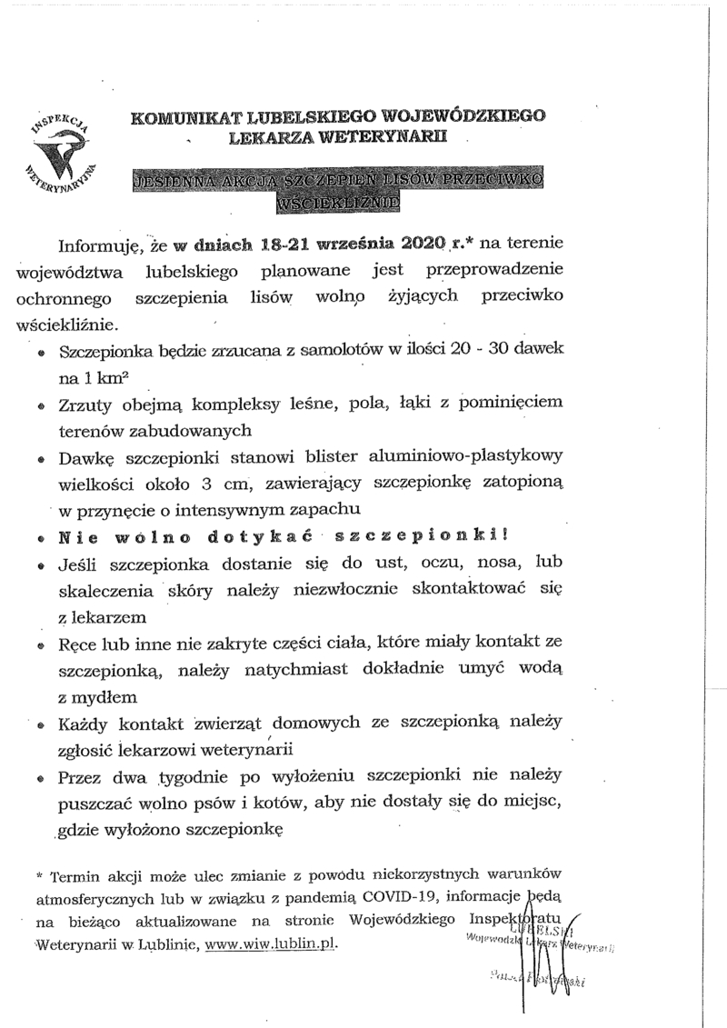 KOMUNIKAT LUBELSKIEGO WOJEWÓDZKIEGO LEKARZA WETERYNARII