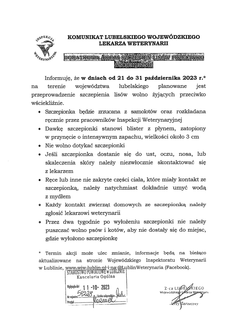 KOMUNIKAT LUBELSKIEGO WOJEWÓDZKIEGO LEKARZA WETERYNARII