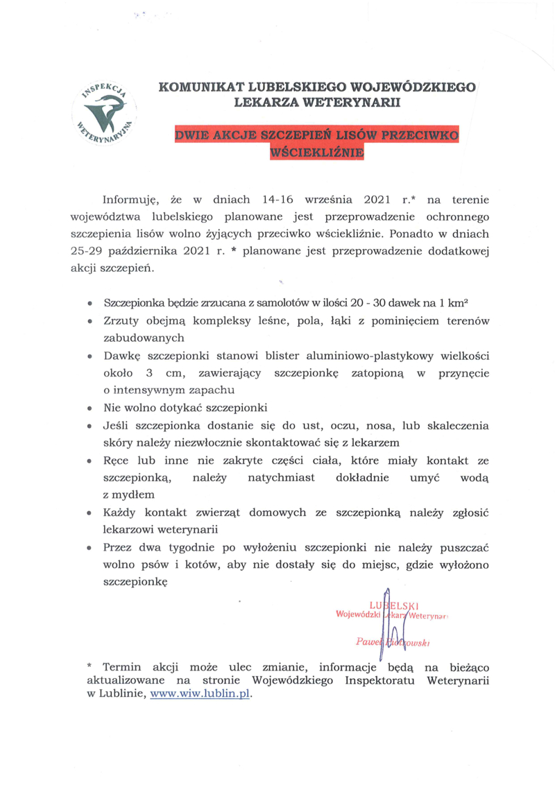KOMUNIKAT LUBELSKIEGO WOJEWÓDZKIEGO LEKARZA WETERYNARII - DWIE AKCJE SZCZEPIEŃ LISÓW PRZECIWKO WŚCIEKLIŹNIE