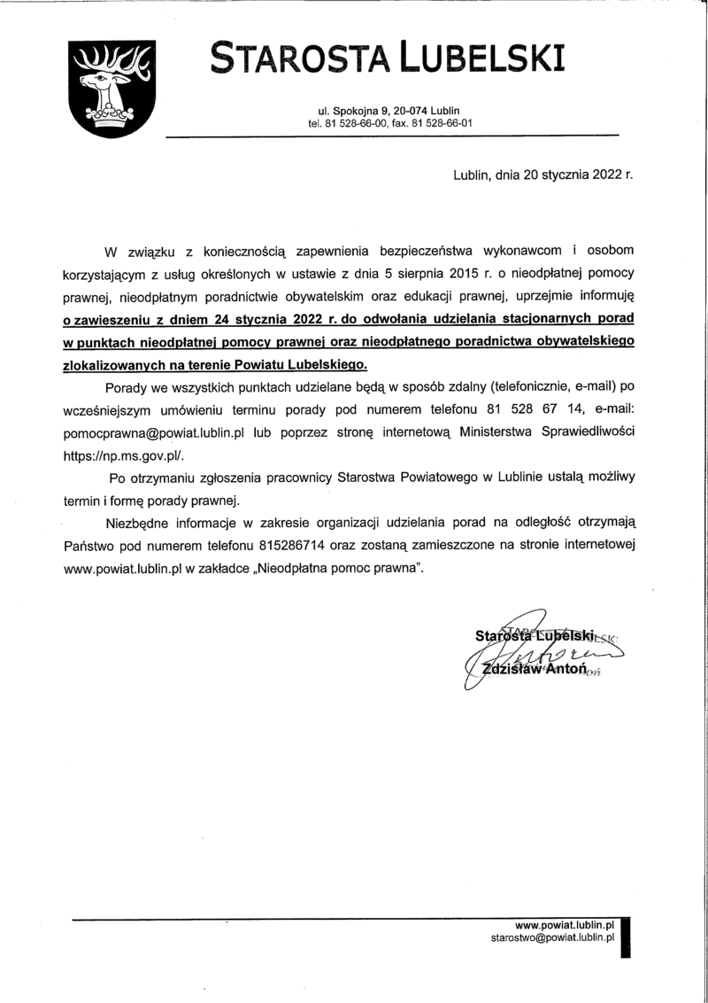 KOMUNIKAT STAROSTY LUBELSKIEGO DOTYCZĄCY NIEODPŁATNEJ POMOCY PRAWNEJ.