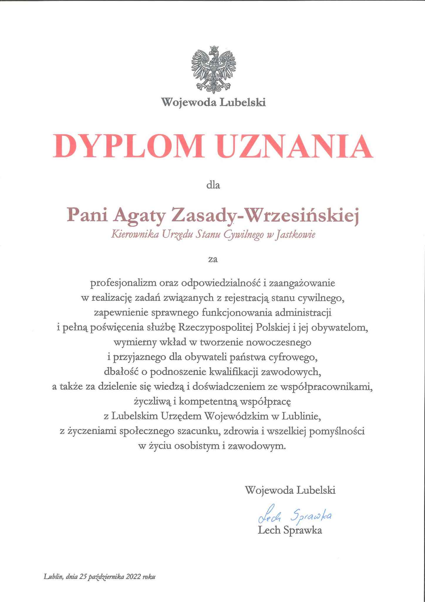 Konferencję poprzedziło uhonorowanie kierowników, zastępców kierowników i pracowników organu nadzoru LUW w Lublinie Dyplomami Uznania Wojewody Lubelskiego przyznanymi m.in. za zapewnienie prawidłowej realizacji zadań administracji rządowej w zakresie nadzoru nad działalnością Urzędu Stanu Cywilnego, kształtowanie jednolitej polityki w zakresie rejestracji stanu cywilnego i pełną poświęcenia służbę RP i jej obywatelom. Wśród uhonorowanych kierowników znalazła się również kierownik USC Jastków Agata Zasada-Wrzesińska.