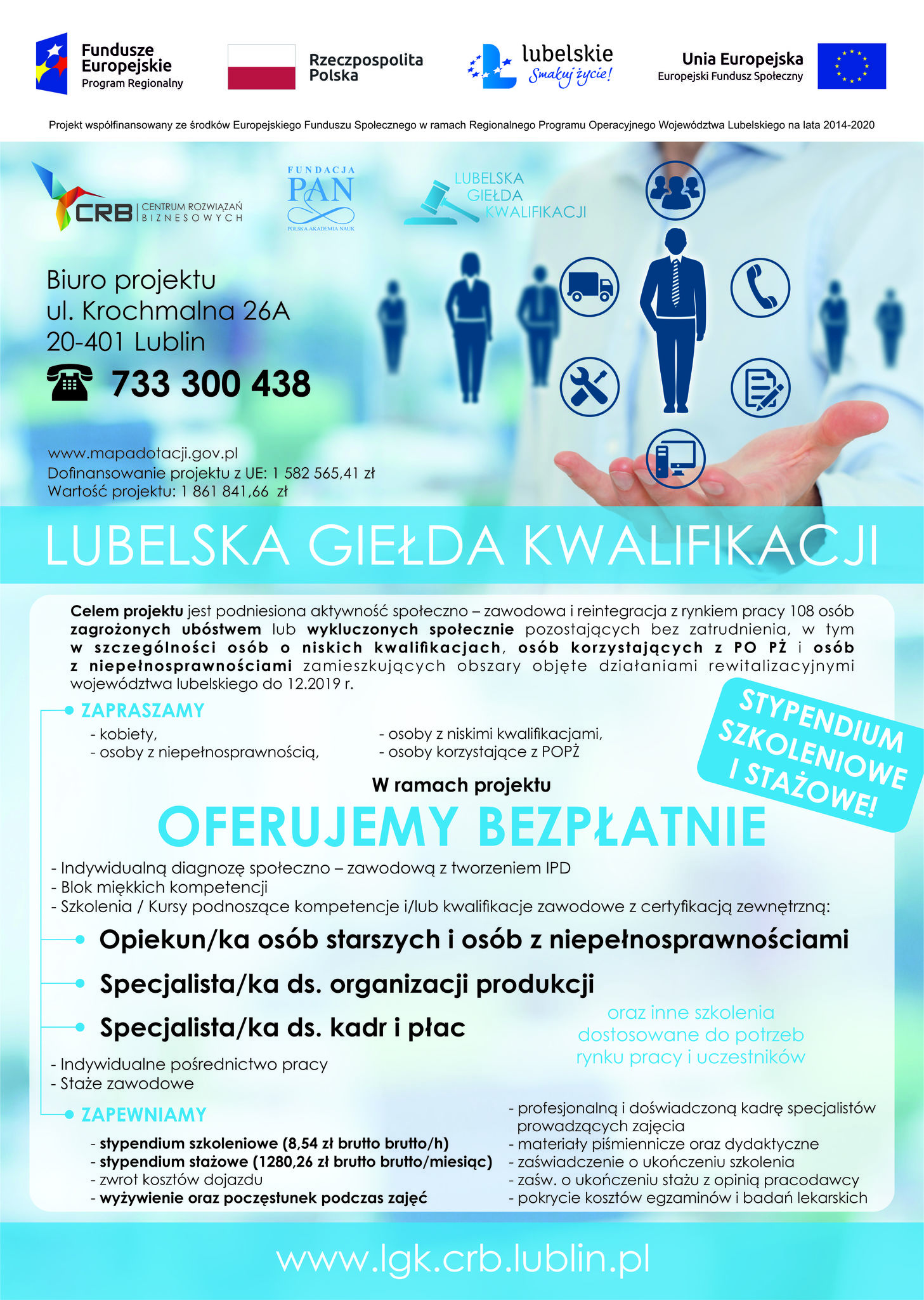Projekt " Lubelska Giełda Kwalifikacji" skierowany jest do 108 osób ( 65 Kobiet i 43 Mężczyzn), osób bezrobotnych lub biernych zawodowo zagrożonych ubóstwem lub wykluczonych społecznie, zamieszkujących tereny objęte programem rewitalizacji gmin: Bełżyce (miasto w gminie miejsko-wiejskiej), Jabłonna, Jastków, Niedrzwica Duża, Świdnik, Lubartów, Kraśnik, Łęcza (miasto w gminie miejsko-wiejskiej), Włodawa, Puławy (gmina wiejska) i Ryki (miasto i obszar wiejski w gminie miejsko-wiejskiej). Powiaty: Zamość, Chełm i Lublin. W szczególności poszukujemy osób zarejestrowanych w Urzędzie Pracy z 3 profilem pomocy oraz osób korzystających z Programu Operacyjnego Pomoc Żywnościowa 2014-2020, osób o niskich kwalifikacjach oraz osób niepełnosprawnych (o znacznym lub umiarkowanym stopniu niepełnosprawności). Projekt zakłada podział na dziewięć 12 osobowych grup.