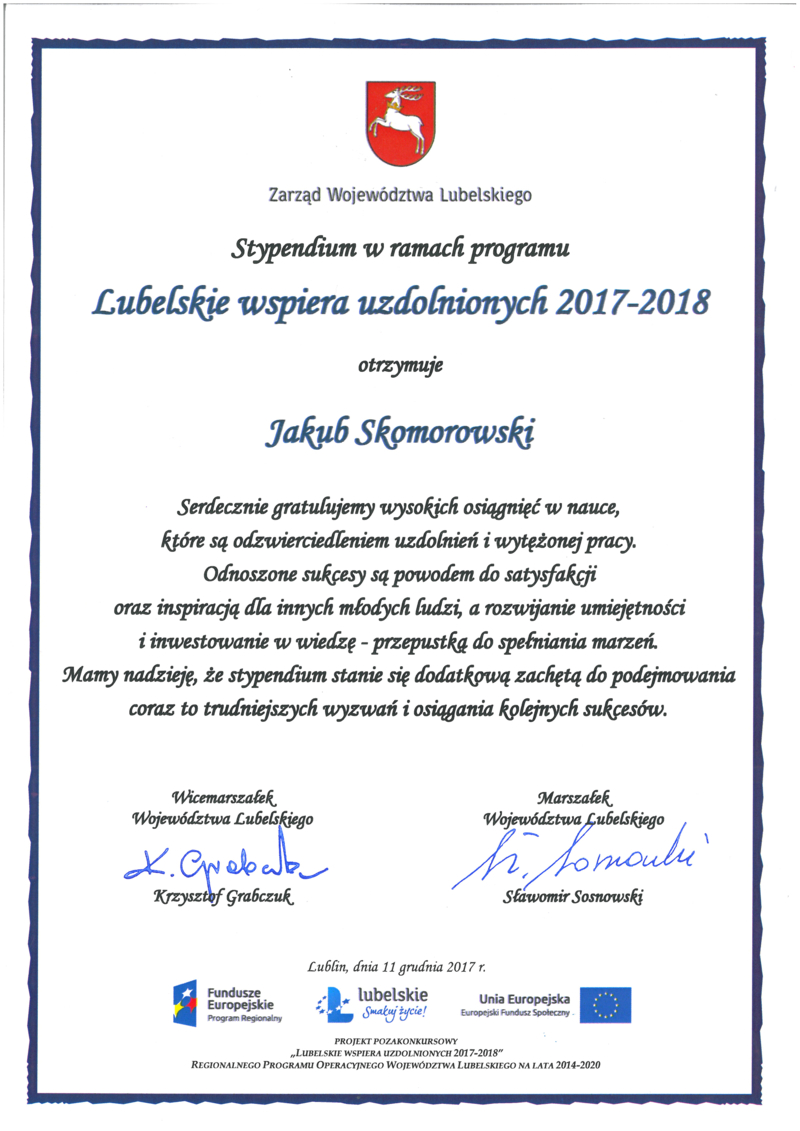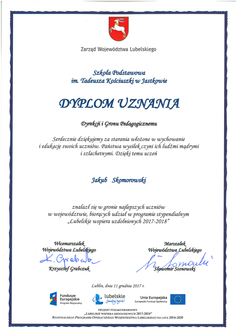Jakub Skomorowski – uczeń trzeciej klasy gimnazjalnej Szkoły Podstawowej im. T. Kościuszki w Jastkowie znalazł się wśród 725 najzdolniejszych uczniów z naszego województwa. Otrzymał stypendium w ramach programu Lubelskie wspiera uzdolnionych 2017 – 2018. Jest to program realizowany przez Województwo Lubelskie w ramach RPO 2014 - 2020. Stypendia, dyplomy oraz listy gratulacyjne uczniowie odebrali podczas uroczystej gali, która odbyła się 11 grudnia 2017 roku w Centrum Spotkania Kultur w Lublinie. Wręczali je: Krzysztof Grabczuk – Wicemarszałek Województwa Lubelskiego, Anna Augustyniak – Sekretarz Województwa oraz Marek Kos – Radny Województwa Lubelskiego. To już dziewiąta edycja programów stypendialnych dla lubelskiej młodzieży, których ideą jest wzmocnienie szans edukacyjnych i poziomu samorealizacji młodych ludzi.