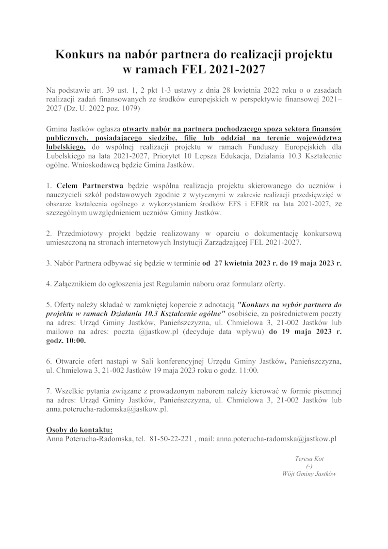 5. Oferty należy składać w zamkniętej kopercie z adnotacją "Konkurs na wybór partnera do projektu w ramach Działania 10.3 Kształcenie ogólne" osobiście, za pośrednictwem poczty na adres: Urząd Gminy Jastków, Panieńszczyzna, ul. Chmielowa 3, 21-002 Jastków lub mailowo na adres: poczta @jastkow.pl (decyduje data wpływu) do 19 maja 2023 r.