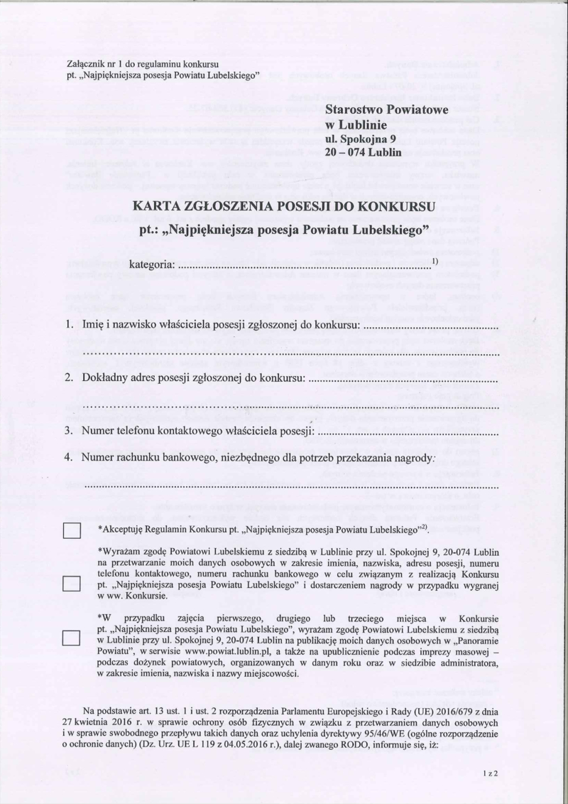 Zgłoszenia należy dokonywać na karcie konkursowej w terminie do dnia 27 lipca 2018r. Warunkiem uczestnictwa w konkursie będzie spełnienie wymogów regulaminowych.Ogłoszenie wyników oraz oficjalne wręczenie nagród laureatom nastąpi 2 września 2018r. podczas dożynek powiatowych w Radawcu Dużym.