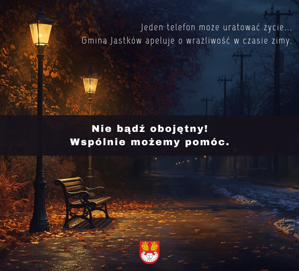 Wójt Gminy Jastków zwraca się do Mieszkańców Gminy z prośbą o reagowanie w sytuacjach nagłych np. gdy ktoś długo przebywa na mrozie lub śpi w miejscu do tego nieprzeznaczonym. Nie bądźmy obojętni na los tych, którzy w chłodne dni poszukują schronienia w piwnicach, altanach, czy opuszczonych budynkach.Pamiętajmy o osobach bezdomnych oraz mieszkających samotnie. Zwracajmy szczególną uwagę na ludzi samotnych, starszych i chorych, którzy żyją w naszym sąsiedztwie i nie zawsze radzą sobie z czynnościami związanymi z ogrzewaniem domu. Zapytajmy, czy czegoś nie potrzebują.