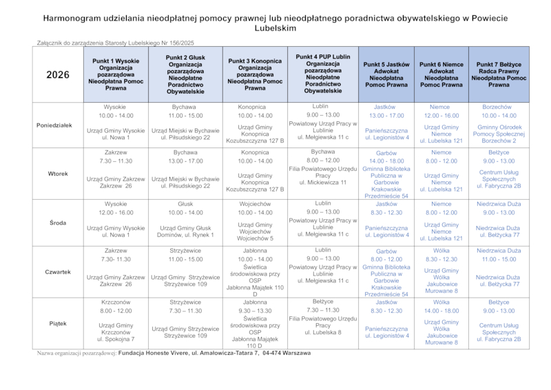 Harmonogram Nieodpłatnej Pomocy Prawnej 2026 r.