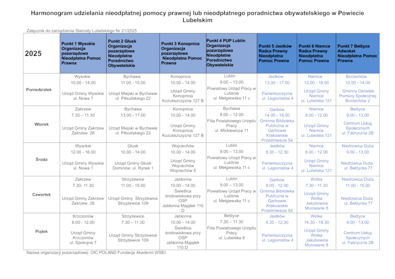 Informacje na temat organizacji pozarządowej prowadzącej w 2025 roku dwa punkty nieodpłatnej pomocy prawnej oraz dwa punkty nieodpłatnego poradnictwa obywatelskiego na terenie powiatu lubelskiego można znaleźć pod linkami: http://pomocprawna.oic.lublin.pl/