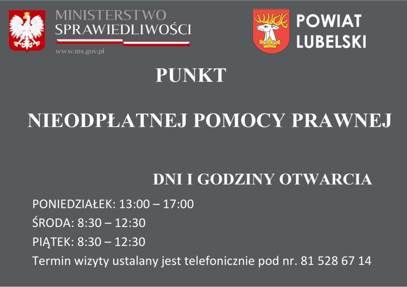 Termin porady ustalany jest telefonicznie pod nr (81) 52 86 714 lub e-mail: pomocprawna@powiat.lublin.pl Porady udzielane są wg kolejności zgłoszeń w każdej Gminie w Powiecie Lubelskim oraz w Powiatowym Urzędzie Pracy.