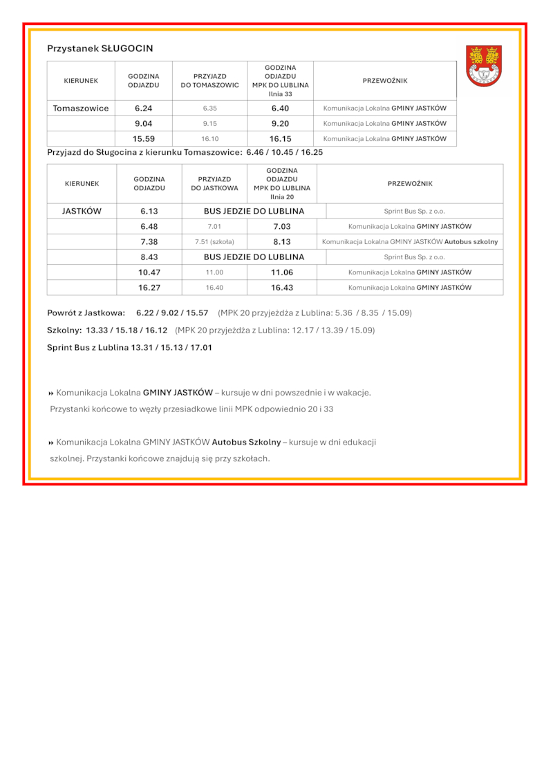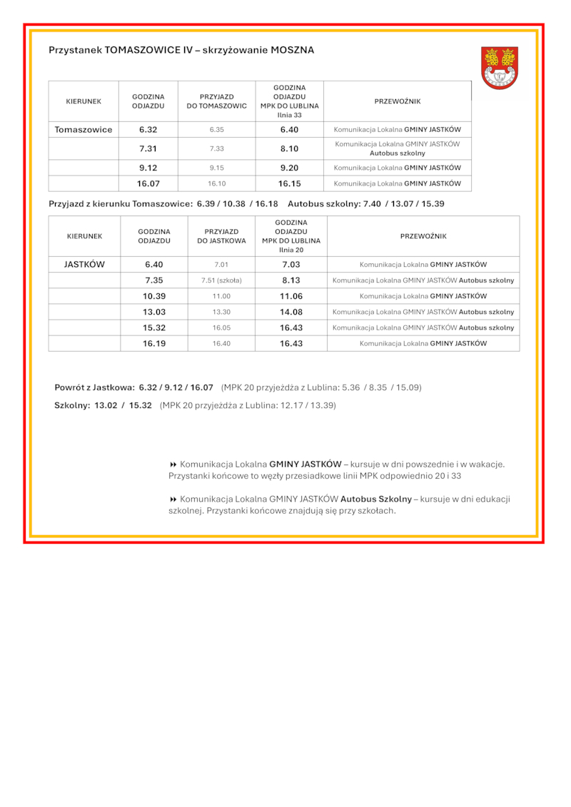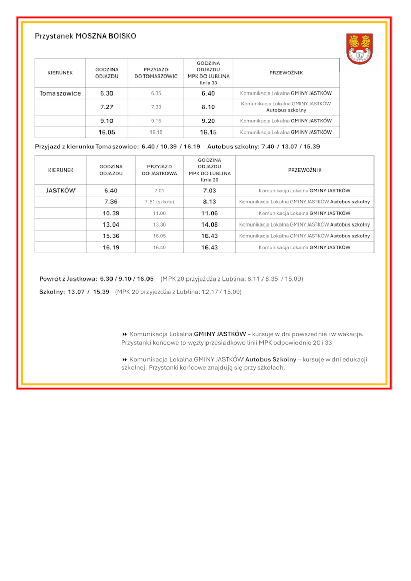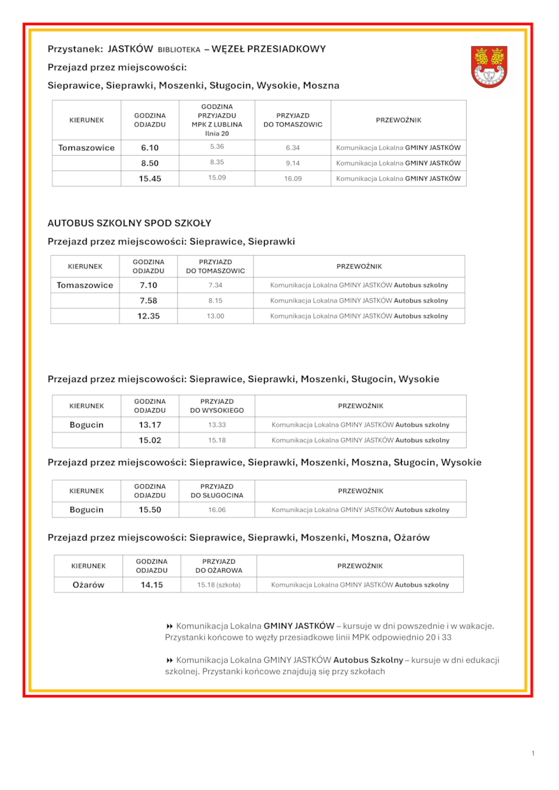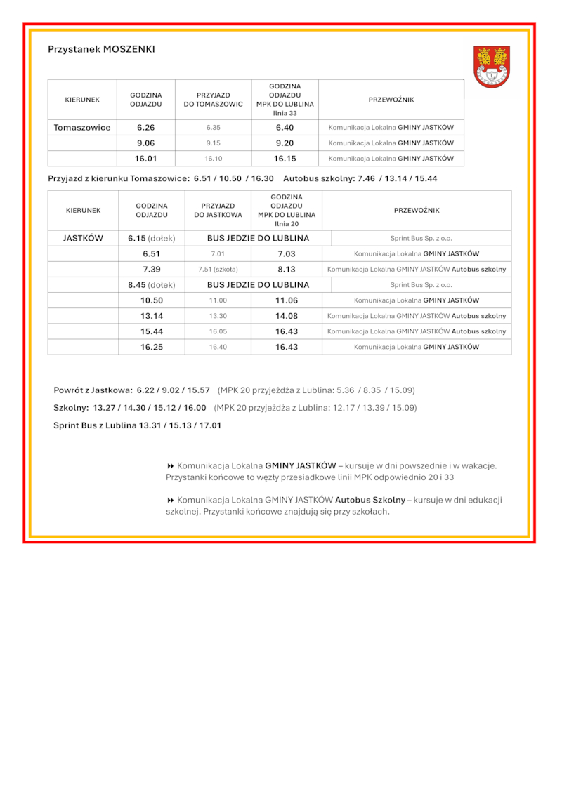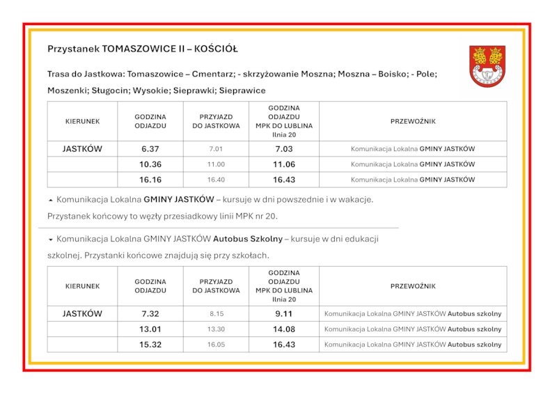 Informujemy, że z dniem 1 marca 2024 r. rusza pilotażowa linia komunikacyjna łącząca miejscowości Jastków, Sieprawice, Sieprawki, Moszenki, Sługocin, Wysokie, Moszna Kolonia, Moszna, Tomaszowice Kolonia.