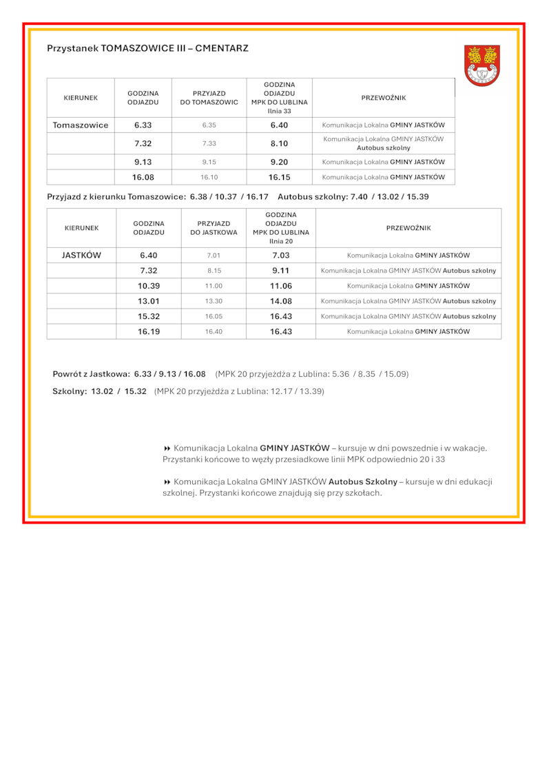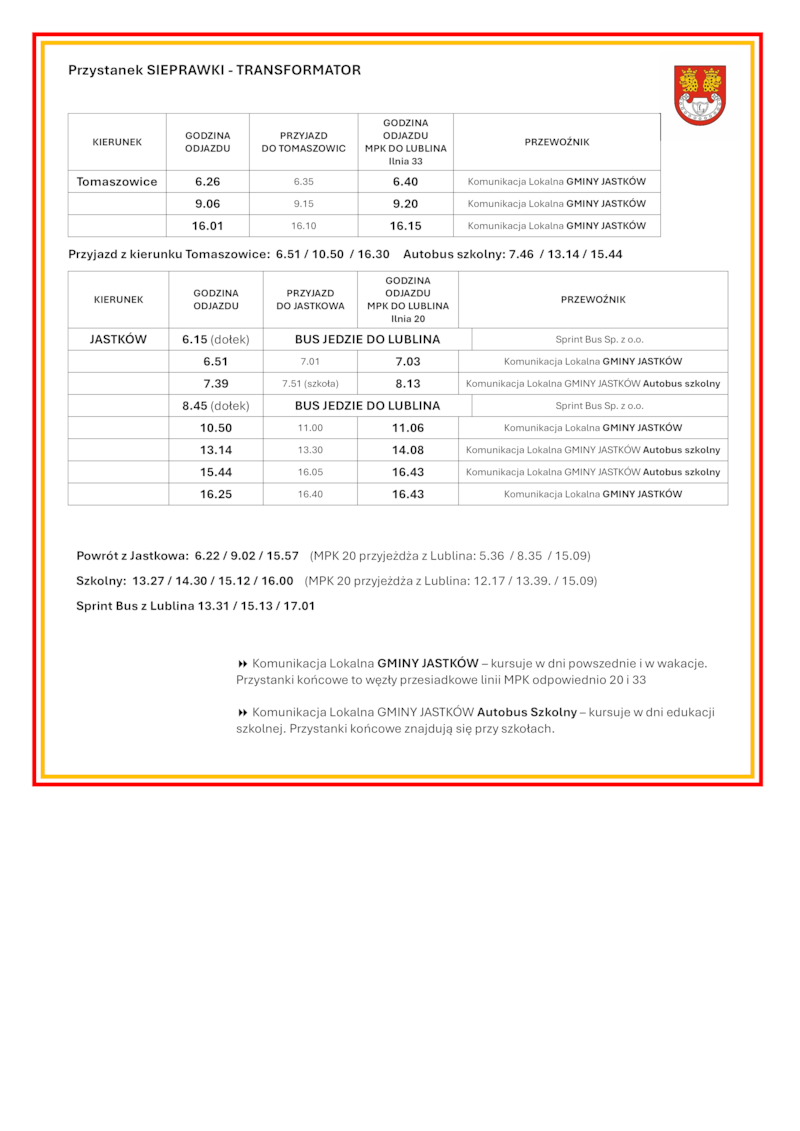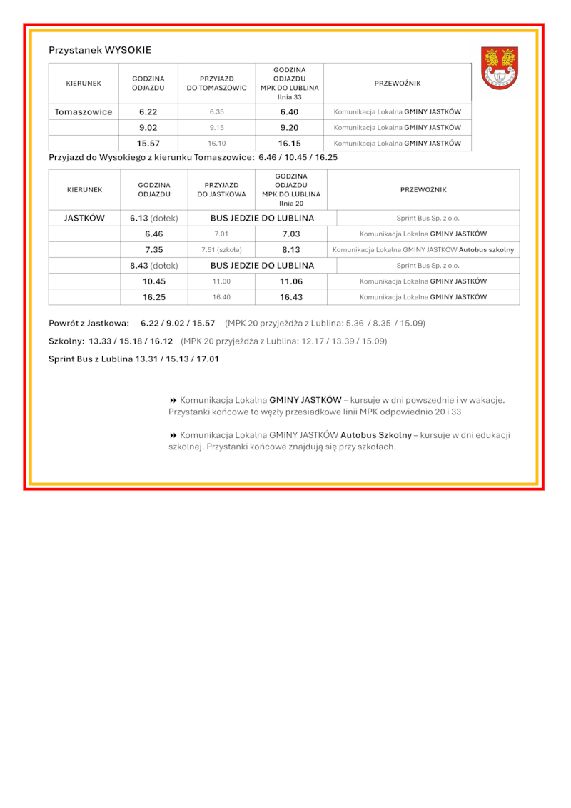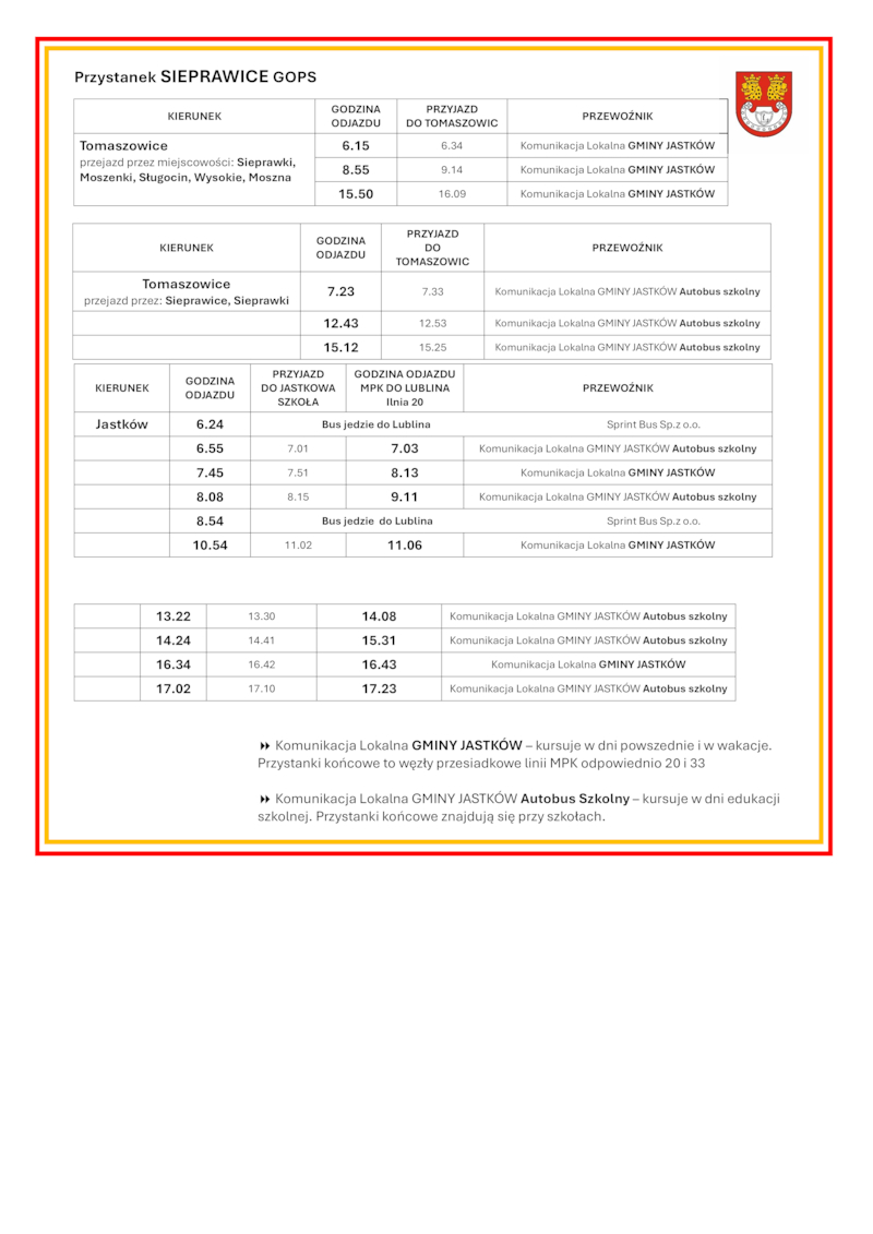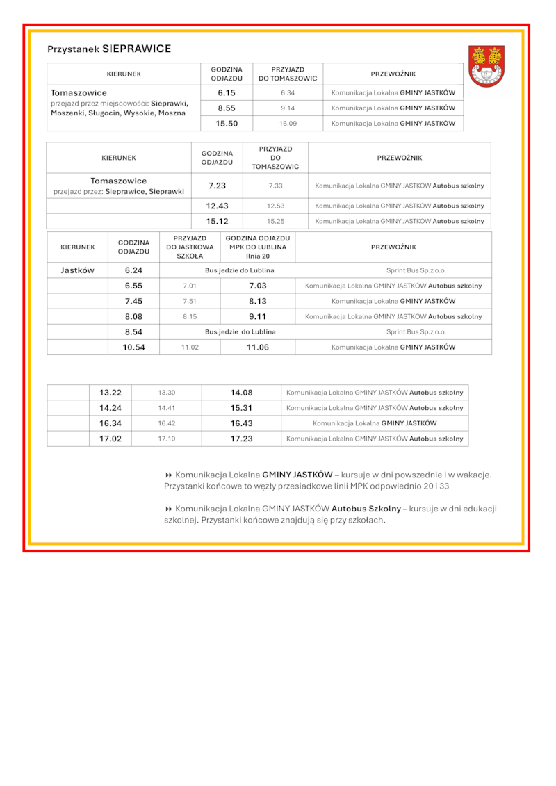 Na poniższych rozkładach uwzględniony został także publiczny transport lokalny oraz prywatni przewoźnicy.